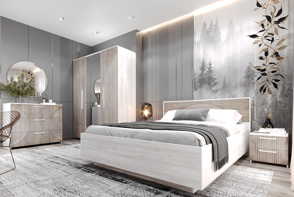 - Состав комплекта двуспальная кровать, комод, тумба, шкаф