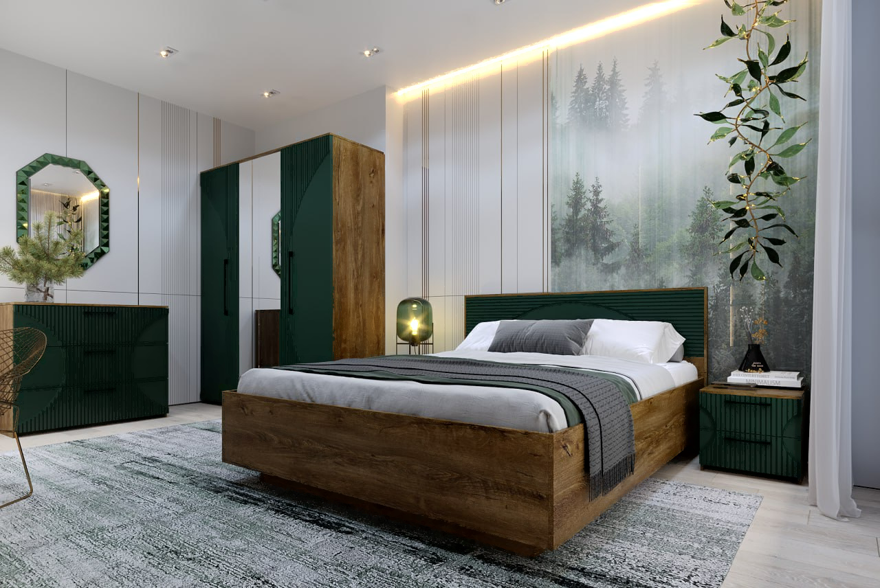 - Состав комплекта двуспальная кровать, комод, тумба, шкаф