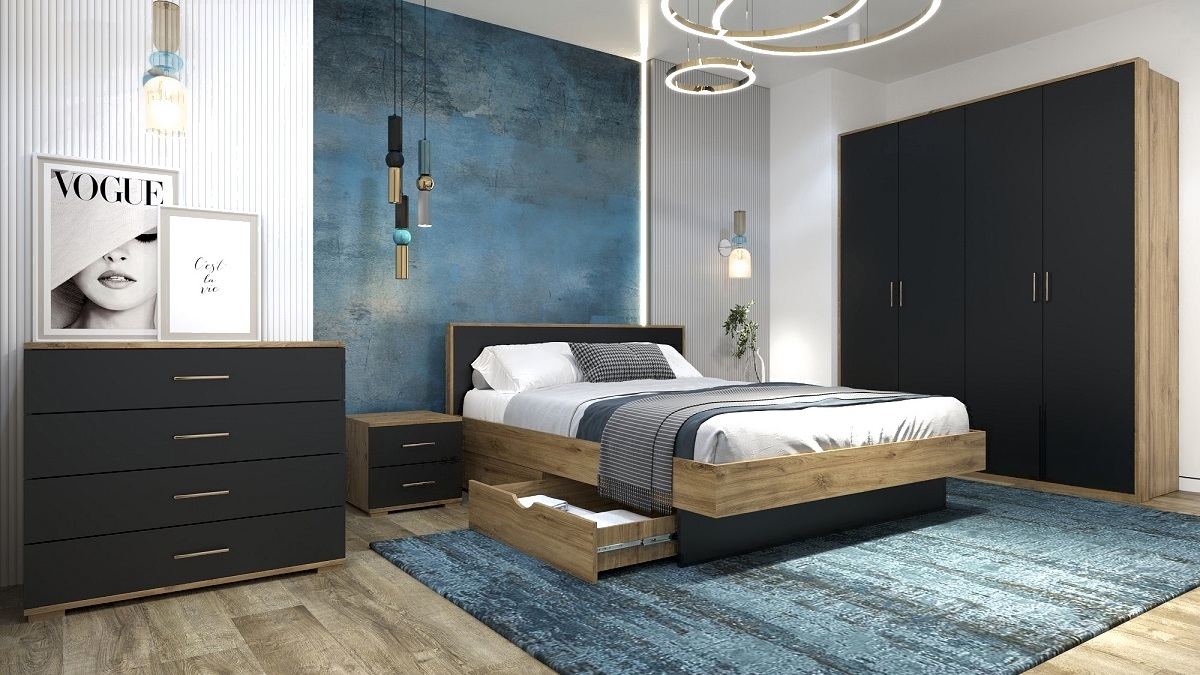 - Состав комплекта двуспальная кровать, тумба, комод, шкаф