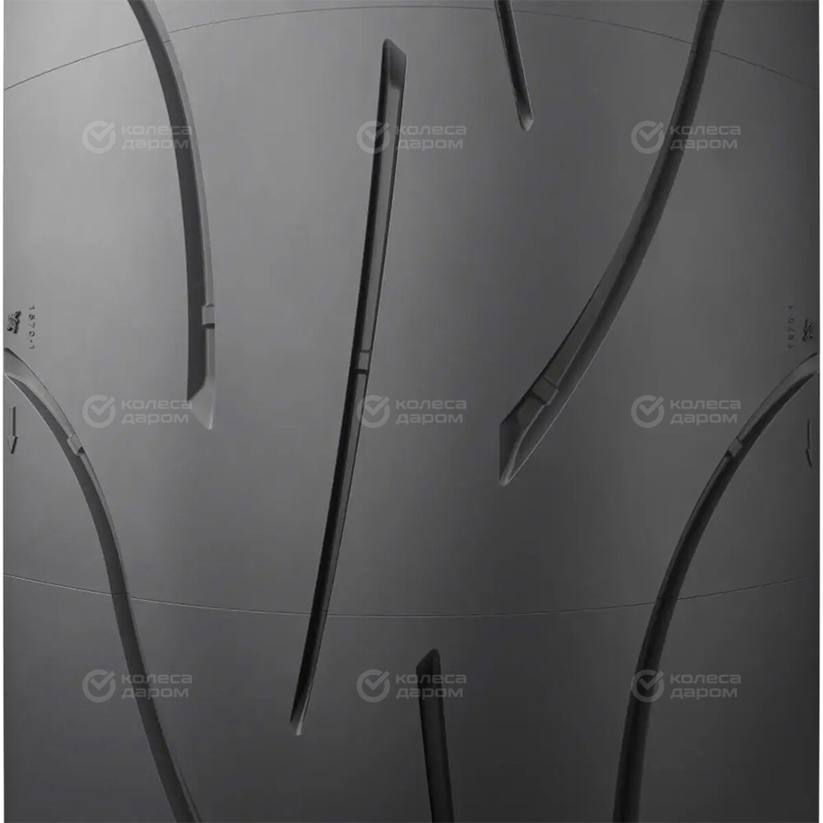 У модели направленный рисунок протектора и двухкомпонентный состав резиновой смеси — мягкие боковины и жесткая центральная часть. Особенность заключается в том, что такой компаунд использовали и для задней, и для передней шины. Так получаем идеальное сцепление с дорожной поверхностью и четкое управление на поворотах.