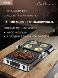• Приготовление продуктов барбекю, бекон, булочки для бургеров, бутерброды, вафли, блинчики, грибы, гриль, котлеты для бургеров, морепродукты, мясо, овощи, птица, рыба, сосиски, стейк, сэндвичи, шаурма