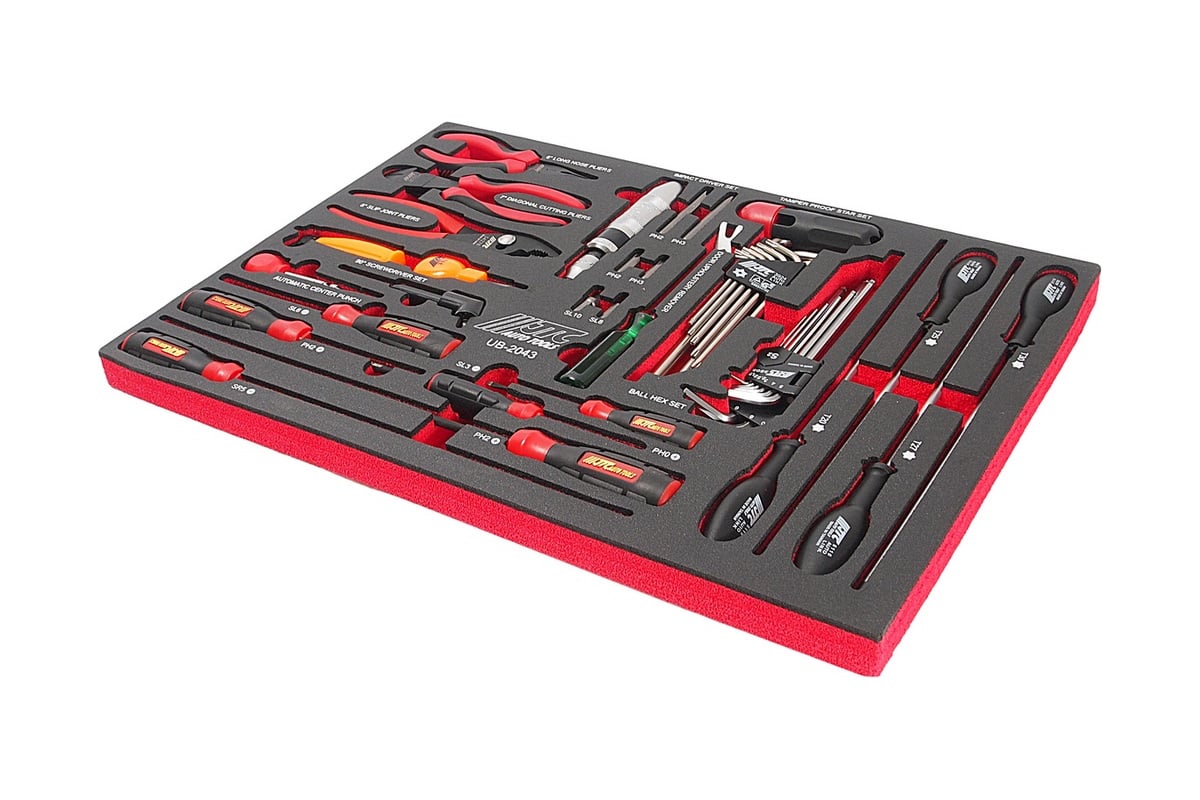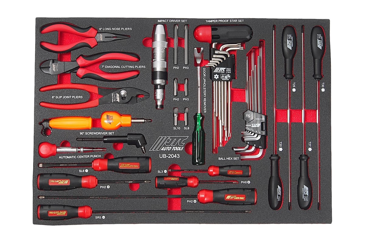 Универсальный набор инструмента, в ложементе 43шт JTC-UB2043 подходит для оснащения рабочих мест в мастерских и сервисах по ремонту автомобилей. Наличие ложемента позволяет удобно разместить комплект данных инструментов на полке в тележке, тумбе, верстаке или стеллаже.