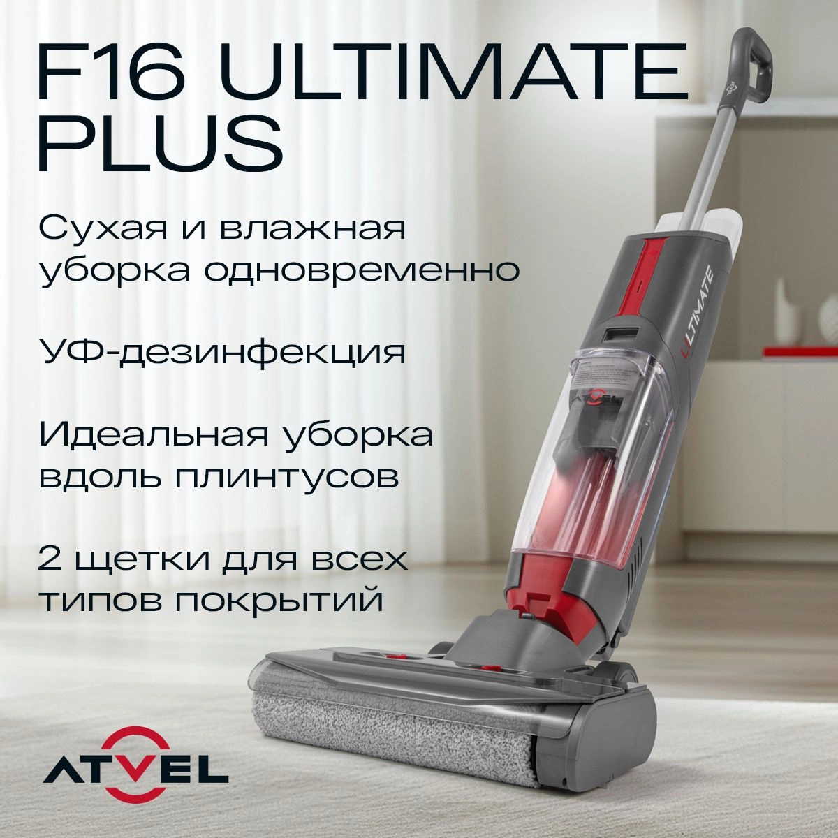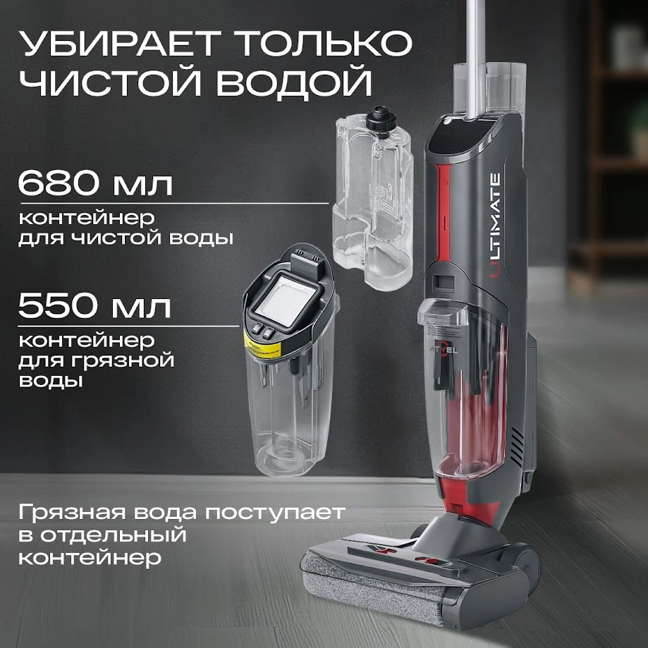ОписаниеМоющий пылесос ATVEL F16 Ultimate Plus - мощный помощник в каждом доме! Сухая и влажная уборка, УФ-дезинфекция и улучшенный чистящий модуль для идеальной уборки вдоль плинтусов делают его универсальным прибором. Он оснащён лампой ультрафиолетовой стерилизации, которая уничтожает вирусы и бактерии.