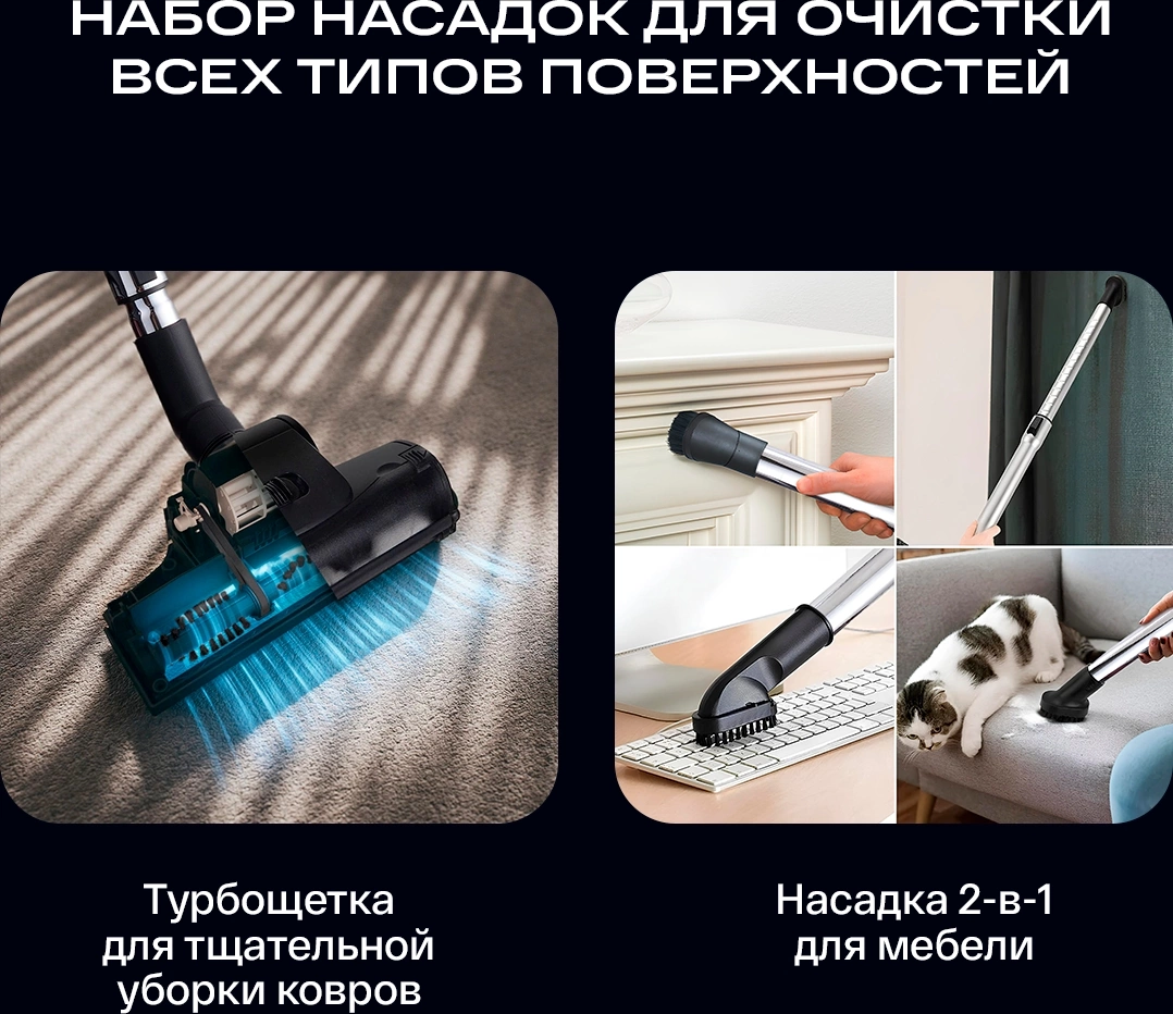 • Аксессуары в комплекте насадка для мягкой мебели, насадка для пола и ковров, турбощетка, щелевая насадка