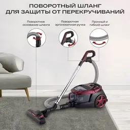• Особенности пылесоса легко очищаемый пылесборник, прорезиненные колеса, шланг