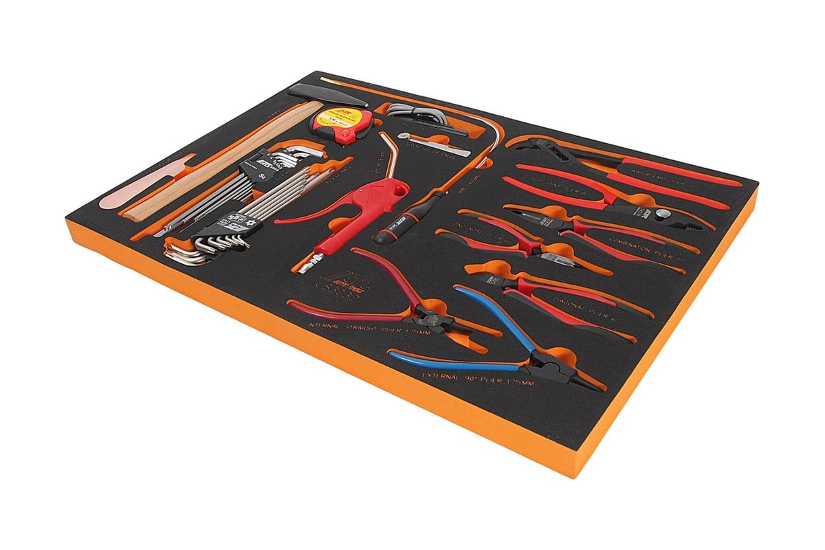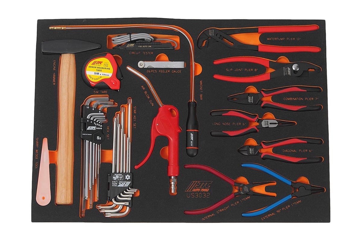 Универсальный набор инструмента, в ложементе 32шт JTC-US3032 включает в себя широкий ассортимент разнообразных по виду и назначению инструментов, которые служат для ремонта автомобилей различных марок и моделей. Данный комплект поставляется на ложементе, благодаря чему удобен при размещении в инструментальных тележках и прочих системах хранения.