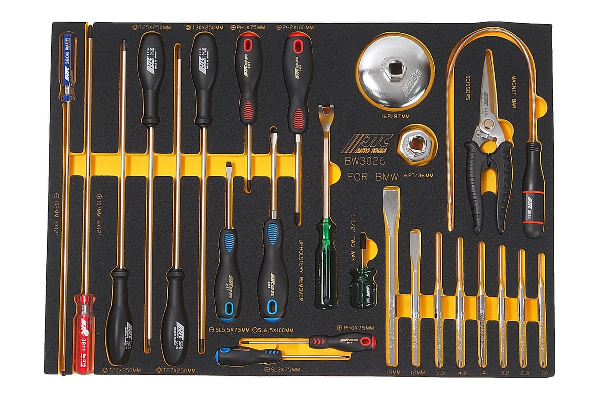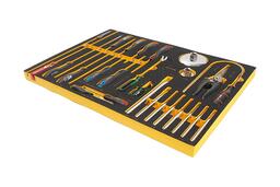 - Комплект поставки Отвертки: SL3.0, 5.5, PH0, PH1 x 3"; SL6.5, PH2 x 4", SL5, PH6 х 12"; двухсторонняя х 1-1/2". Съемник пистонов. Ножницы многофункциональные. Захват магнитный гибкий 20". Съемники масляного фильтра: 6РТ/36 мм., 16РТ/87 мм. Зубило: 12х150 мм., 19х200 мм. Выколотки: 1.6, 2.3, 3.2, 4.0, 4.8, 5.5 мм. Отвертки Torx (250 мм.): Т20-Т30. Ложемент.