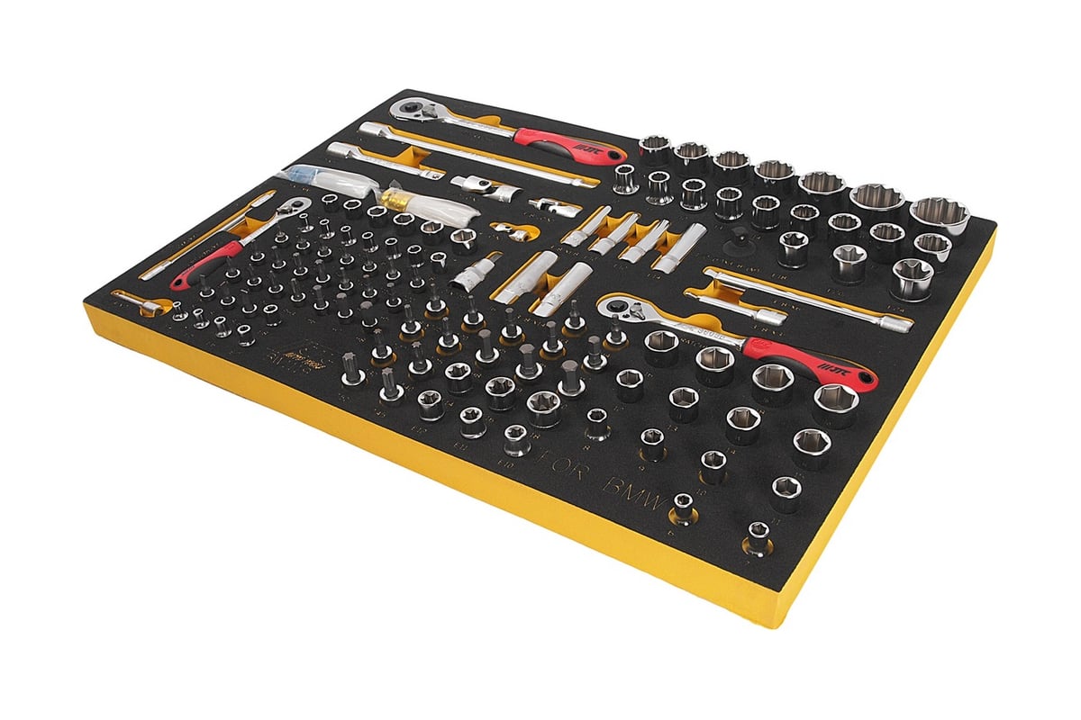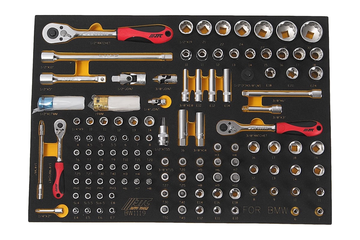 Универсальный набор инструмента, комплектация BMW в ложементе 119шт JTC-BW1119 - это комплект трещоточных отверток, широкого ассортимента бит и торцевых головок, адаптеров и удлинителей, который подойдет для пополнения инструментального арсенала любого мастера. Представленный набор широко распространен для эксплуатации в автосервисных мастерских и на СТОА.
