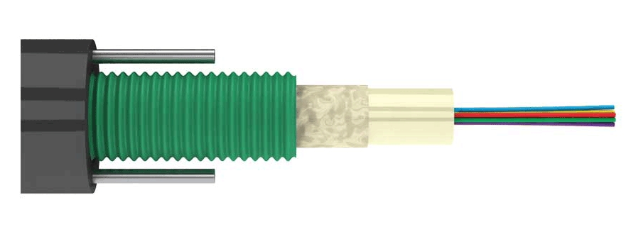 Кабель содержит оптический модуль со свободно уложенными волокнами. Свободное пространство в оптическом модуле заполнено гидрофобным гелем. Поверх модуля накладывается броня из гофрированной стальной ленты и оболочка из полиэтилена средней плотности, стойкая к УФ-излучению. Свободное пространство под гофрированной лентой заполнено гидрофобным гелем. В оболочке кабеля диаметрально противоположно расположены две стальные проволоки, которые выполняют функции силовых элементов.