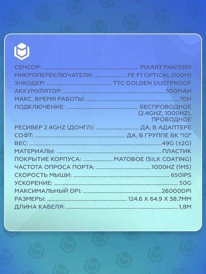 • ✅ IO by Red Square Aurora - это ультралегкая беспроводная игровая мышь весом всего 49 граммов, выполненная в стильном сочетании бирюзового и розового цветов. Эргономичная форма и гладкая поверхность обеспечивают комфорт даже при длительном использовании, а яркий современный дизайн отлично дополнит игровой сетап.✅ Мышь оснащена высокоточным оптическим сенсором Pixart PAW3395 с максимальным разрешением 26000 dpi, что гарантирует отличную отзывчивость и контроль в любой игровой ситуации. Благодаря изменяемому разрешению пользователь может быстро подстроить чувствительность под свои задачи прямо во время игры.✅ Устройство поддерживает как беспроводное подключение по радиоканалу с помощью USB-приемника, так и проводное подключение через кабель USB Type-C, что обеспечивает универсальность использования и возможность работать даже во время зарядки. Встроенная память позволяет сохранять настройки и использовать программируемые кнопки для различных сценариев.✅ IO by Red Square Aurora также оснащена яркой подсветкой, дополнительными кнопками для быстрого доступа к функциям, а также современными программными возможностями. Эта игровая мышь станет отличным выбором для геймеров, ценящих производительность, легкость и стиль. ✅ IO by Red Square Aurora - это ультралегкая беспроводная игровая мышь весом всего 49 граммов, выполненная в стильном сочетании бирюзового и розового цветов. Эргономичная форма и гладкая поверхность обеспечивают комфорт даже при длительном использовании, а яркий современный дизайн отлично дополнит игровой сетап.✅ Мышь оснащена высокоточным оптическим сенсором Pixart PAW3395 с максимальным разрешением 26000 dpi, что гарантирует отличную отзывчивость и контроль в любой игровой ситуации. Благодаря изменяемому разрешению пользователь может быстро подстроить чувствительность под свои задачи прямо во время игры.✅ Устройство поддерживает как беспроводное подключение по радиоканалу с помощью USB-приемника, так и проводное подключение через кабель USB Type-C, что обеспечивает универсальность использования и возможность работать даже во время зарядки. Встроенная память позволяет сохранять настройки и использовать программируемые кнопки для различных сценариев.✅ IO by Red Square Aurora также оснащена яркой подсветкой, дополнительными кнопками для быстрого доступа к функциям, а также современными программными возможностями. Эта игровая мышь станет отличным выбором для геймеров, ценящих производительность, легкость и стиль.