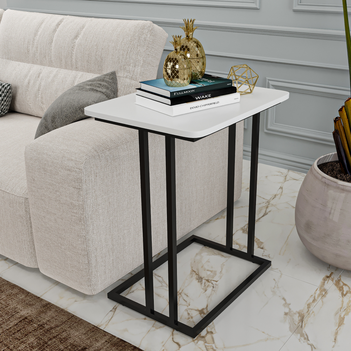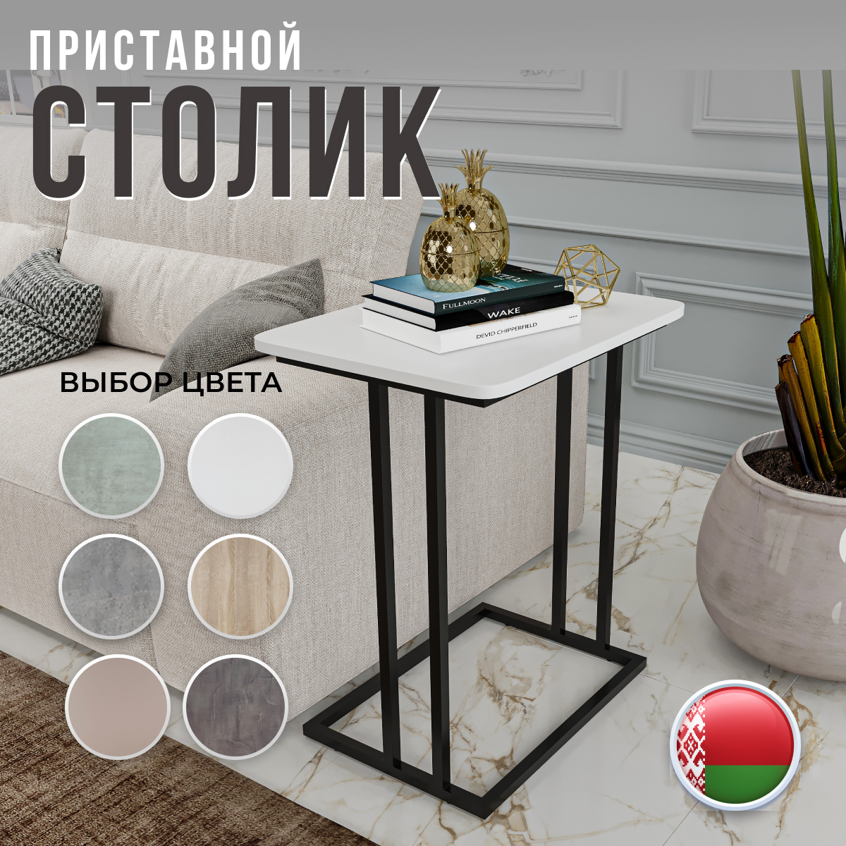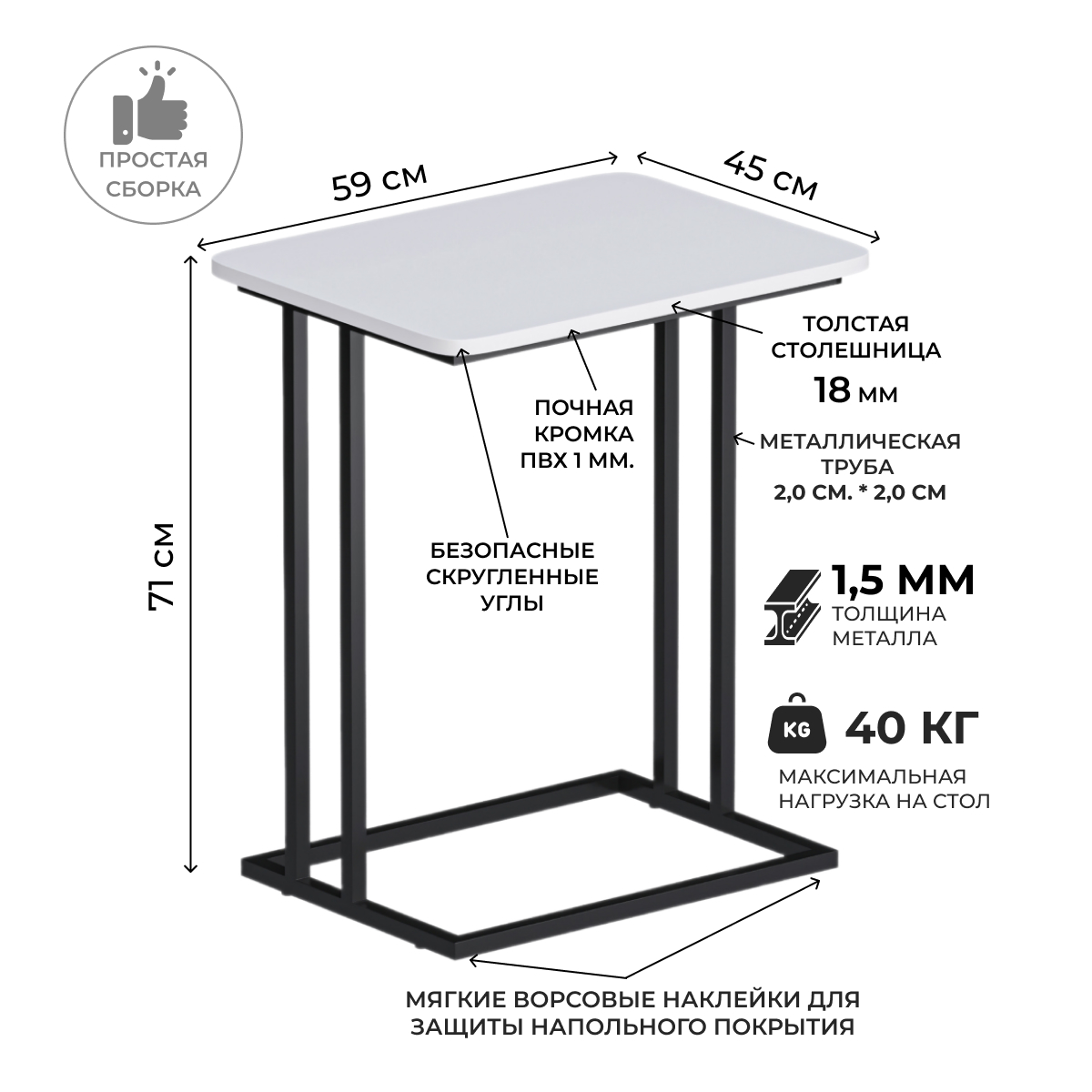 Приставной столик размерами 59х45 см и высотой 71 см является отличным дополнением к любому интерьеру. Этот стильный предмет мебели весит всего 6 кг. Он легко перемещается в любой уголок дома или офиса, не занимая много места. Этот многофункциональный предмет в стиле лофт может использоваться как компьютерный или придиванный столик. Минималистичный дизайн в скандинавском стиле делает этот столик подходящим для любого современного или традиционного внутреннего обустройства. Сделанный в Беларуси, он обладает качеством и долговечностью. Качественные материалы и превосходное мастерство белорусского производства гарантируют, что этот прикроватный столик прослужит вам много лет. Он идеален для размещения бокала вина и тарелки с закусками во время небольшой вечеринки, романтического вечера или как стойка для ноутбука, когда вам нужно работать из дома. Несмотря на его легкий вес, конструкция этого стола с легкостью выдерживает нагрузку до 20 кг! Каркас выполнен из трубы 2,0 см.*2,0 см. с толщи