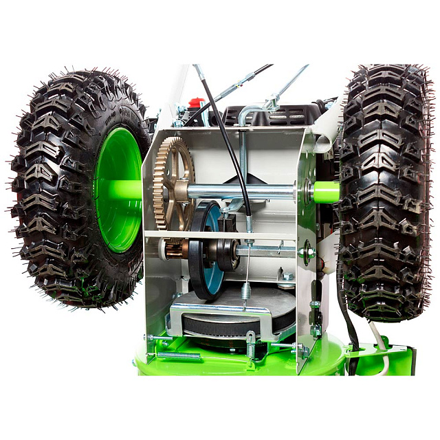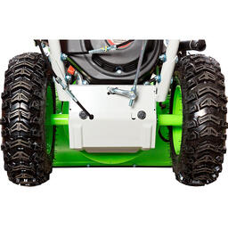 Самоходный привод обеспечивает комфортную работу, позволяя оператору сосредоточиться на уборке снега. Снегоочиститель оснащен большими колесами с глубоким протектором, которые упрощают перемещение и предотвращают пробуксовку на обледенелых участках. Широкие 13-дюймовые шины обеспечивают устойчивость и маневренность агрегата.