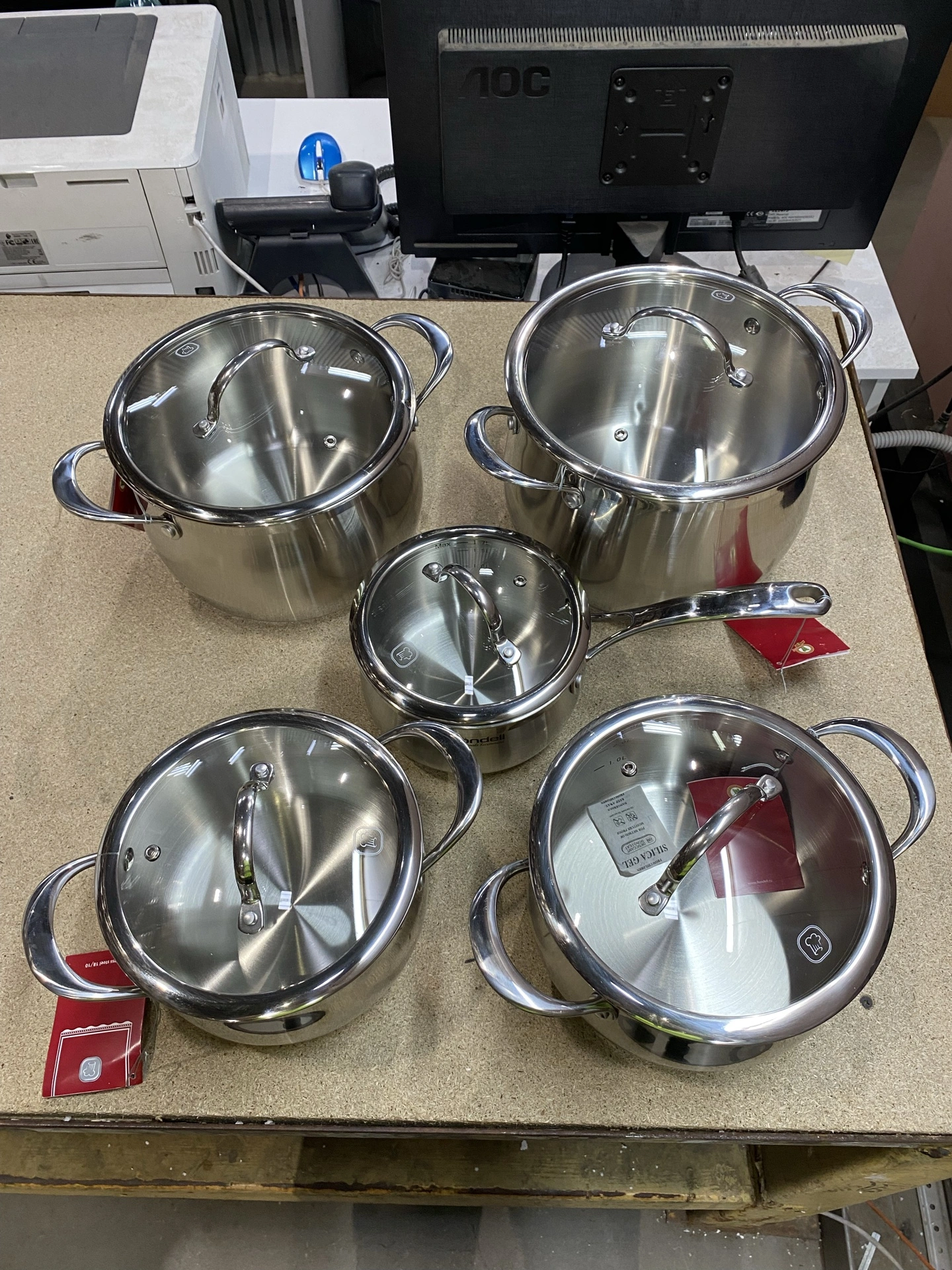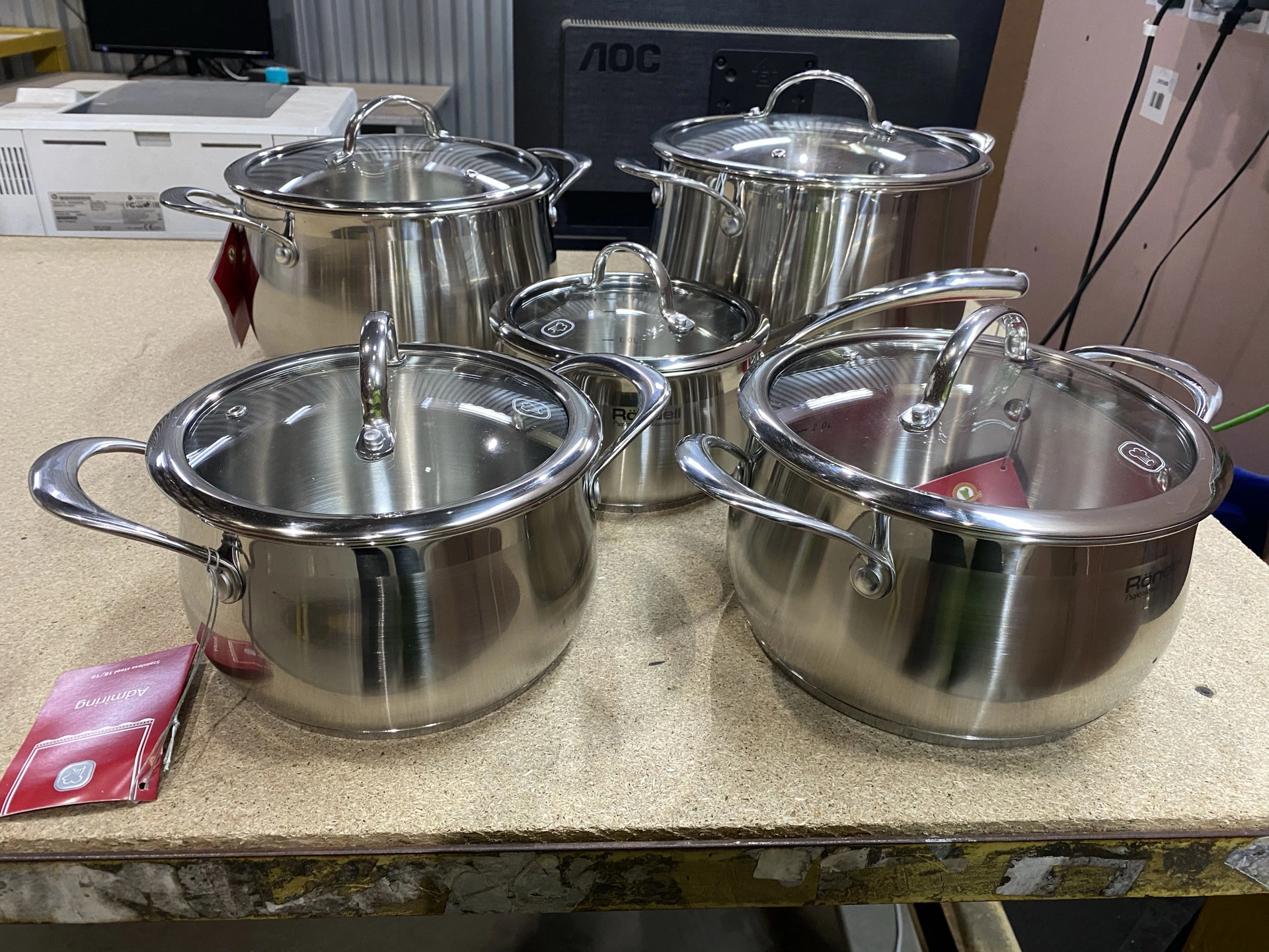 Состав комплектаКастрюли 18 см, 20 см, 22 см, 24 см, ковш 16 см со стеклянными крышками