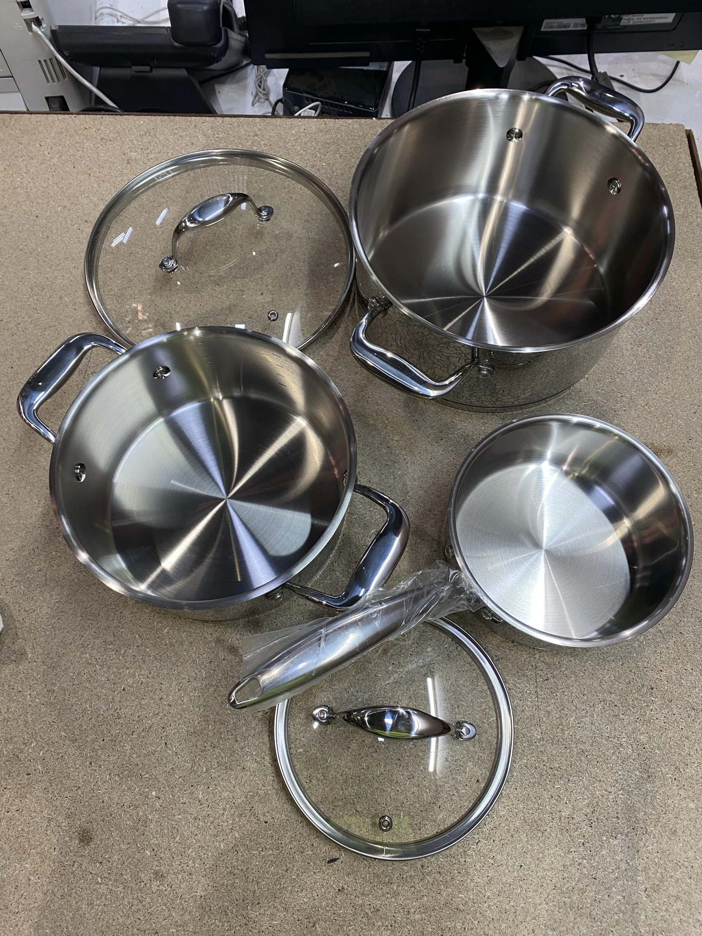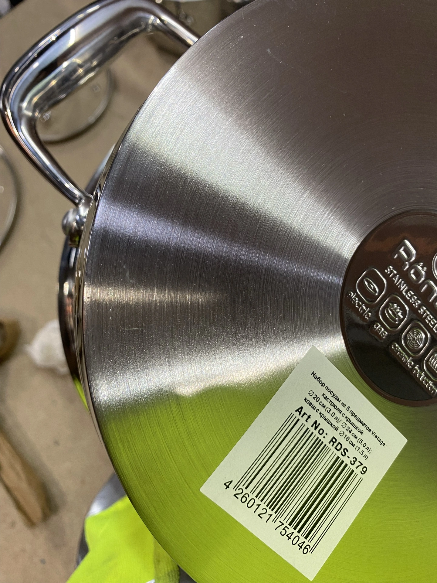Состав комплектаКовш 16 см (1,5 л). Крышка 16 см. Кастрюля 20 см (3 л). Крышка 20 см. Кастрюля 24 см (5 л). Крышка 24 см
