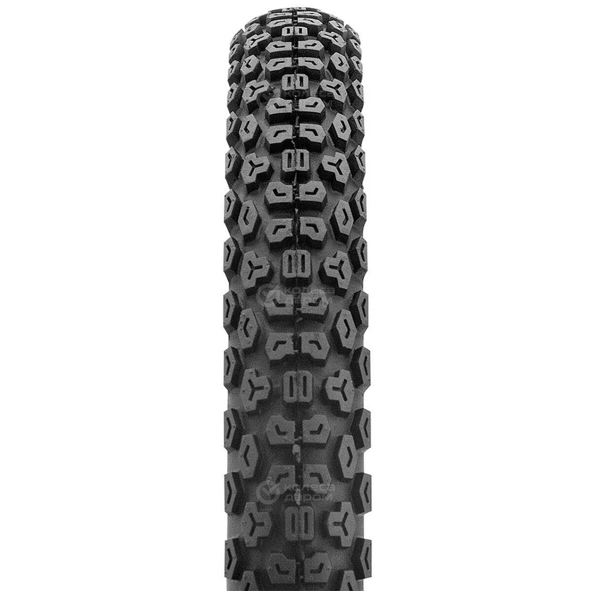У протектора переднего колеса меньшая ширина беговой части с более мелкими по размеру блоками в виде шашечек.