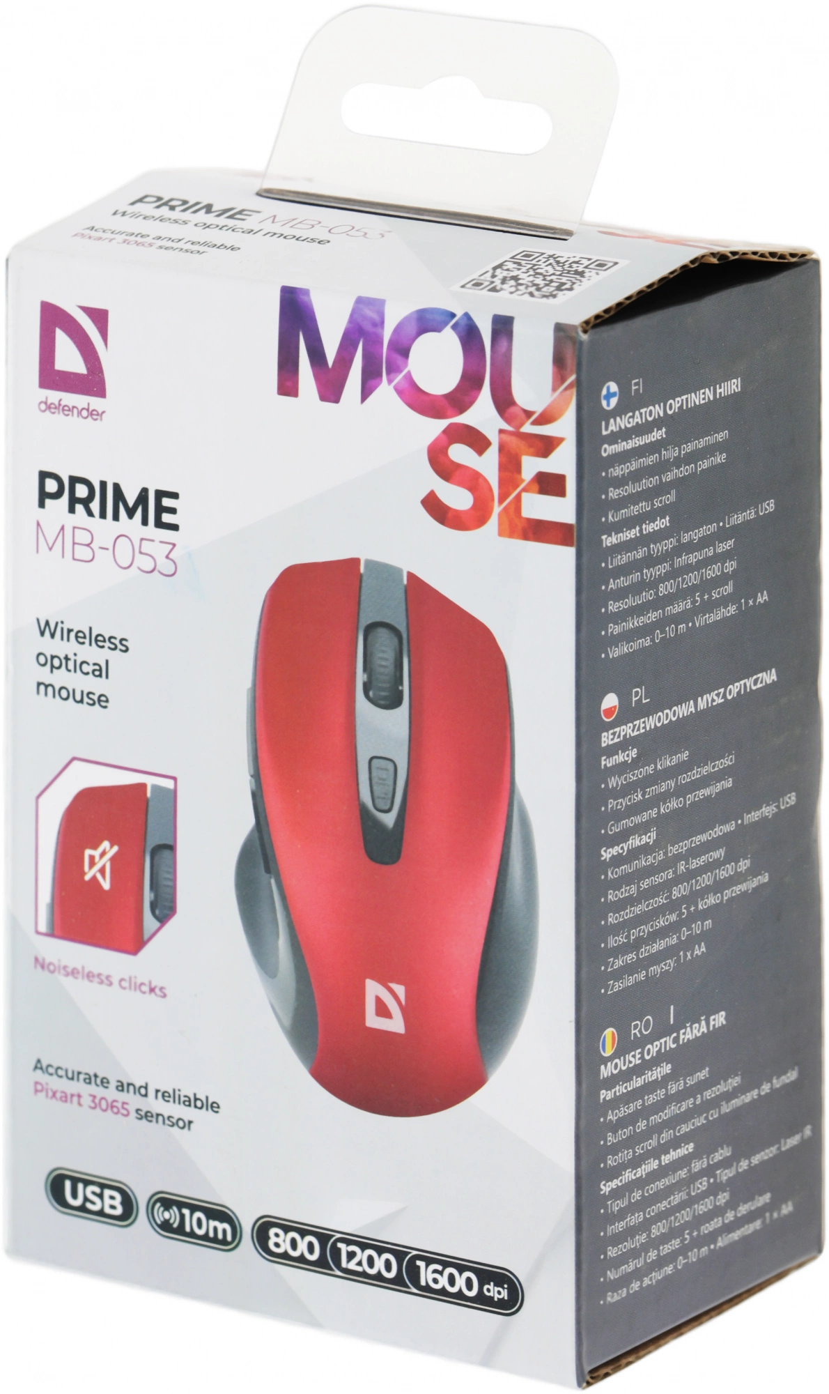 Мышь Defender Prime MB-053 красный/черный оптическая 1600dpi silent беспров. USB для ноутбука 5but (52052)
