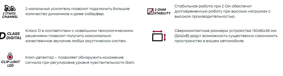 • Мощность на канал при 2 Ом 150 Вт