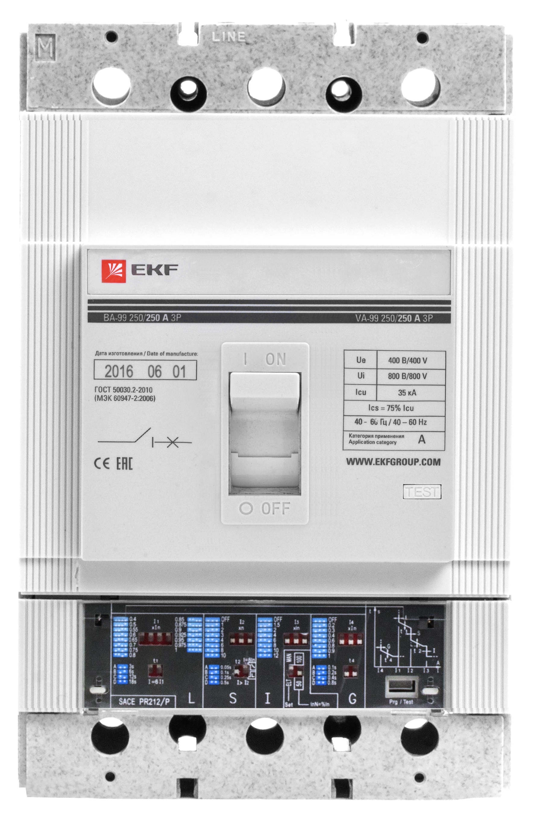 "Выключатель ВА-99 выполнен в виде моноблока и состоит из основания и крышки с фальшпанелью, в которой имеется окно для рукоятки управления и толкатель кнопки «Тест» - проверки механизма отключения выключателя.