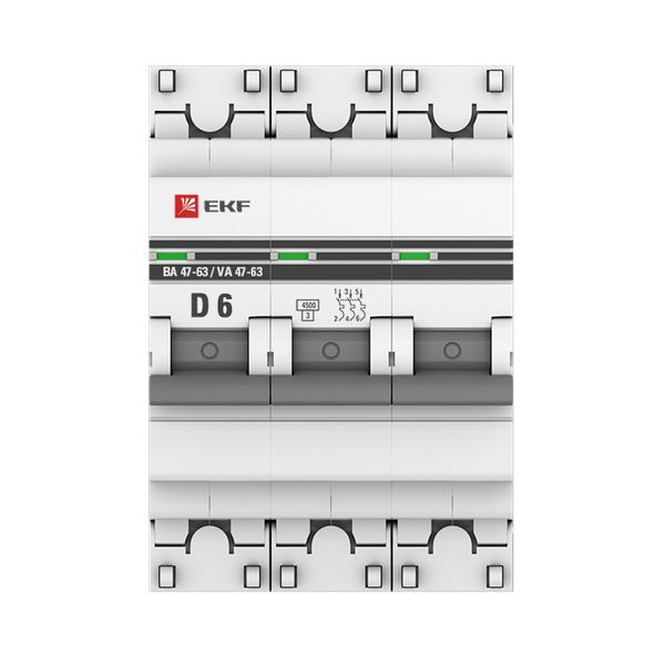 Автоматические выключатели ВА 47-63 4,5 кА EKF PROxima являются механическими коммутационными аппаратами, производятся в одно-, двух-, трех- и четырехполюсном исполнениях и соответствуют ГОСТ Р50345-2010. Особенностью данной серии выключателей является усовершенствованная конструкция. В выключателях имеются пластиковые крышки, закрывающие доступ к винтовому зажиму и служащие для опломбирования выключателей, что исключает несанкционированный доступ к проводникам. Корпус выключателей усилен дополнительными заклепками для устранения эффекта расхождения корпуса. Выключатели оборудованы удобной ручкой управления, обеспечивающей надежное оперирование изделиями. На лицевой панели выключателей имеется цветовой индикатор состояния. Конструкция установочного зажима обеспечивает свободную установку выключателя на DIN-рейку.