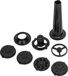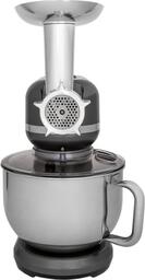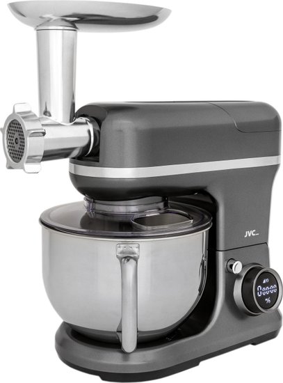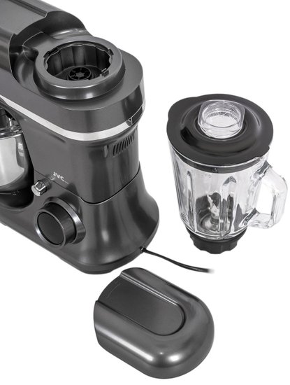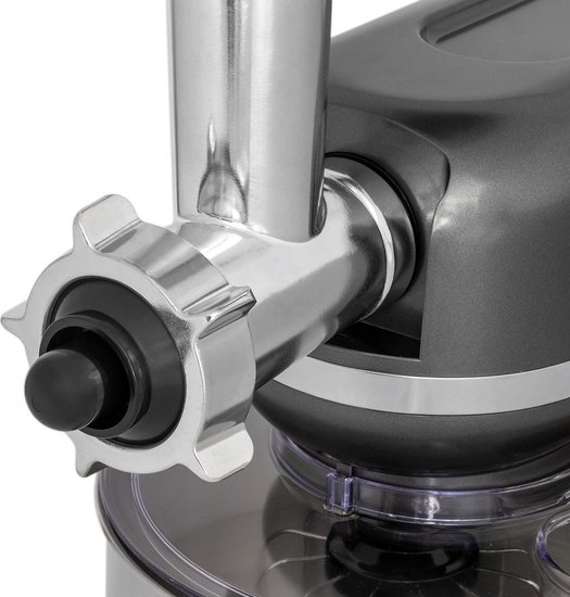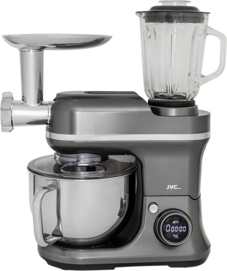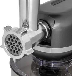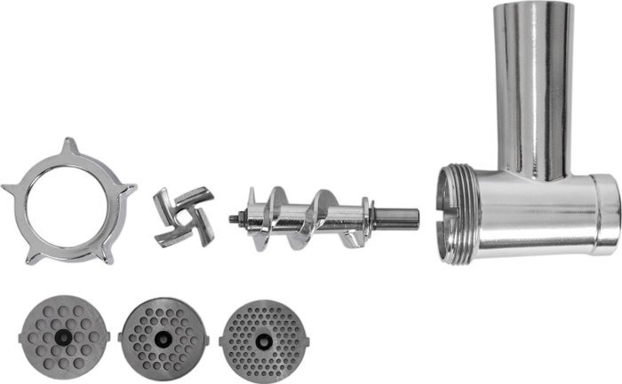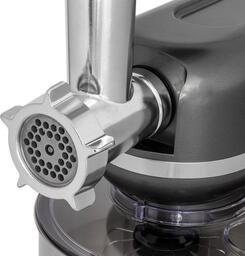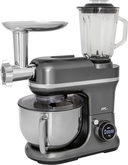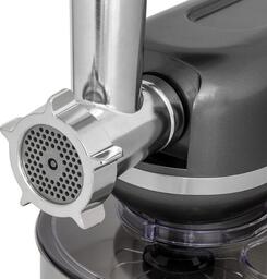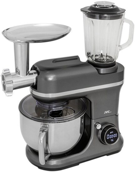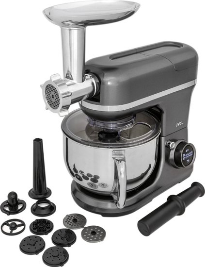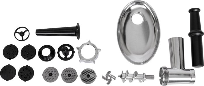 Полная комплектациямиксер, стальная чаша с ручкой, крышка стальной чаши для хранения, полипропиленовая чаша, защитная крышка чаши, крючок для замеса теста, лопатка для перемешивания, венчик для взбивания, комплект насадок для функции мясорубки, кувшин блендера с ножами и крышкой, книга рецептов, гарантийный талон, инструкция на русском языке