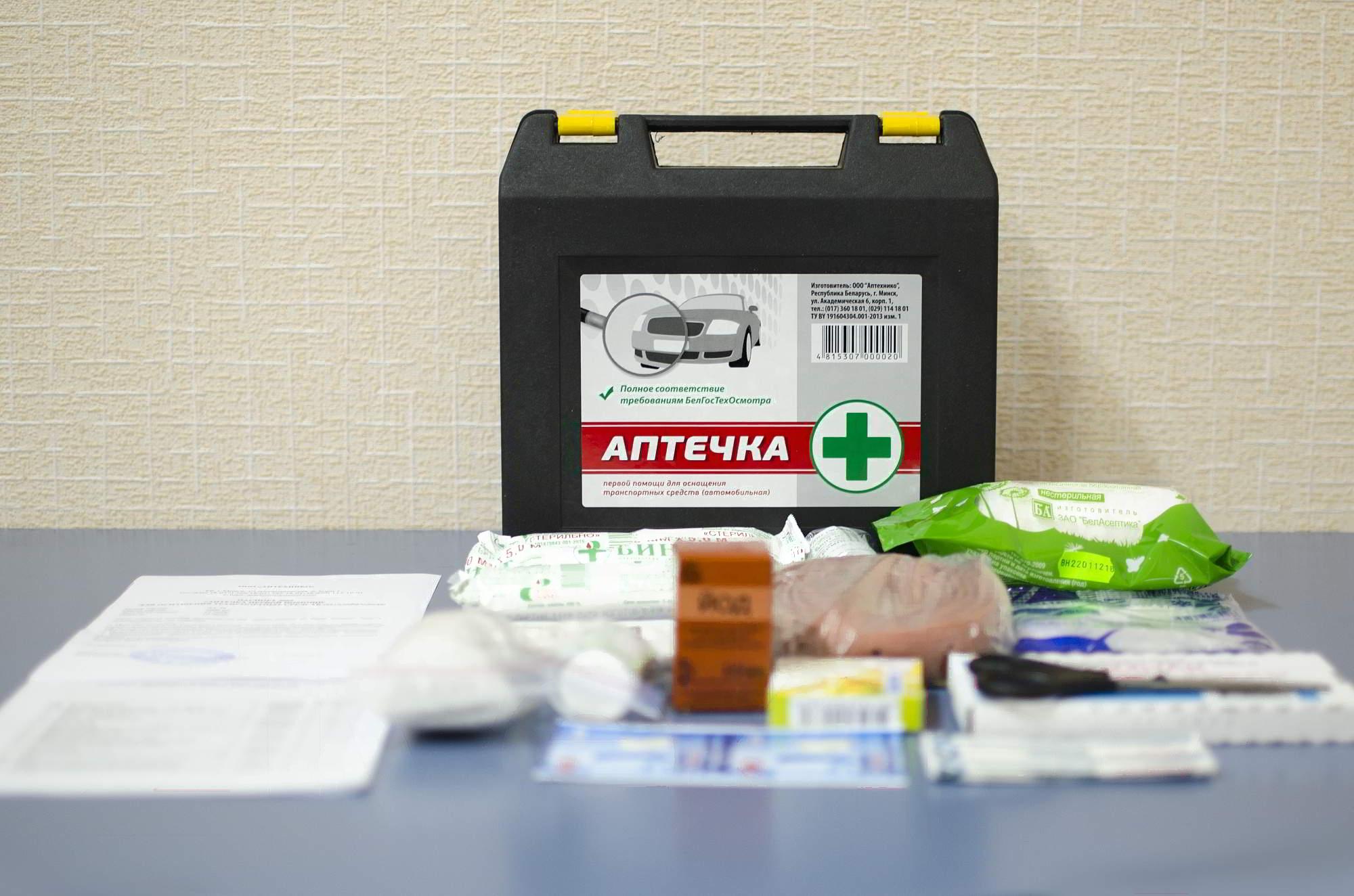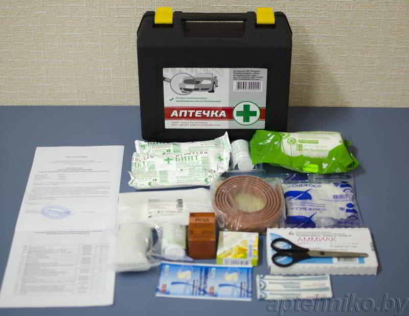 - Комплектация аптечки спирт нашатырный (раствор 10 % – 1 мл № 10: 1 упаковка), йод (спиртовой раствор 5 % – 10 мл или 5 % – 1 мл № 10: 1 флакон/упак), бинт нестерильный (5мх5см: 2 упаковки, 5мх10см: 2 упаковки), бинт стерильный (5мх10см: 1 упаковка), бинт эластичный (нестерильный трубчатый № 1, 3, 6: 1 упаковка), вата (гигроскопическая 50,0: 1 упаковка), жгут (кровоостанавливающий Эсмарха: 1 упаковка), лейкопластырь бактерицидный (бактерицидный:2,5х7,2см: 3 упаковки, 4х10см (6х10см): 1 упаковка), ножницы (тупоконечные не менее 13 см: 1 шт), пакет гипотермический (охлаждающий: 1 упаковка), салфетка стерильная (10х10 см №1: 4 упаковки), лейкопластырь катушечный (1х500 см (2х500 см): 1 упаковка)
