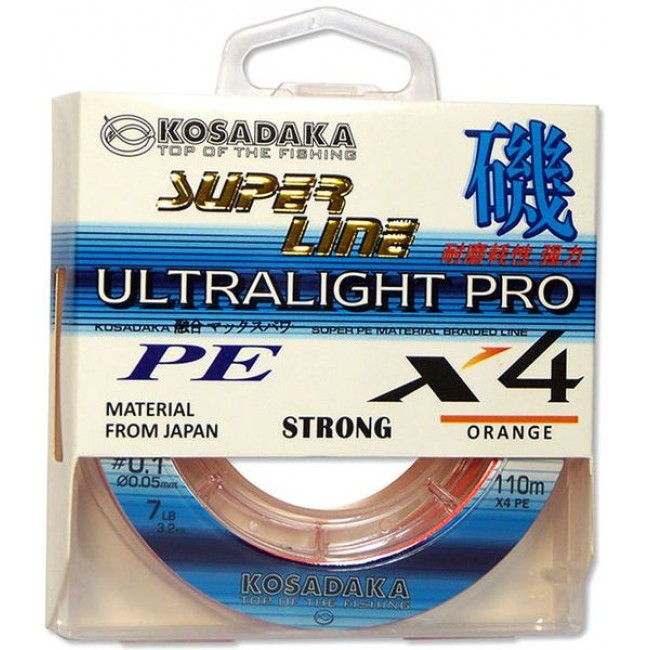 По замыслу разработчиков Косадака, предназначение данной плетенки из семейства Super Line - это рыбалка на осторожную рыбу при значительной конкуренции. Линейка была выпущена в 2020 г. Позиционируется как спортивная. Произведена экспертами Kosadaka из японского сырья. Тончайшие волокна PE максимально плотно переплетены. В результате сечение круглое, поверхность гладкая и скользкая. Внутри колец леска пролетает почти без трения, что способствует в целом лучшим кастинговым показателям. У шнура хороший прочностной запас, в том числе на узлах. Сенсорика дает возможность отслеживать очень неуверенные, деликатнейшие поклевки и четко контролировать анимацию. По словам разработчиков, PE X4 Ultralight Pro почти не боится воздействия солнечных лучей и соприкосновения с песчаным дном или иным абразивом.