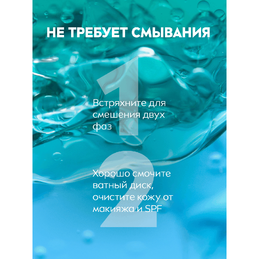 ПРИМЕНЕНИЕ: Встряхните для смешения двух фаз. Хорошо смочите ватный диск, очистите кожу от макияжа и туши, не требует смывания