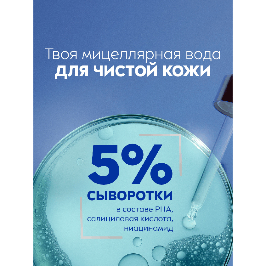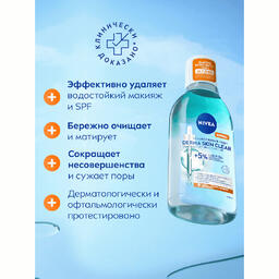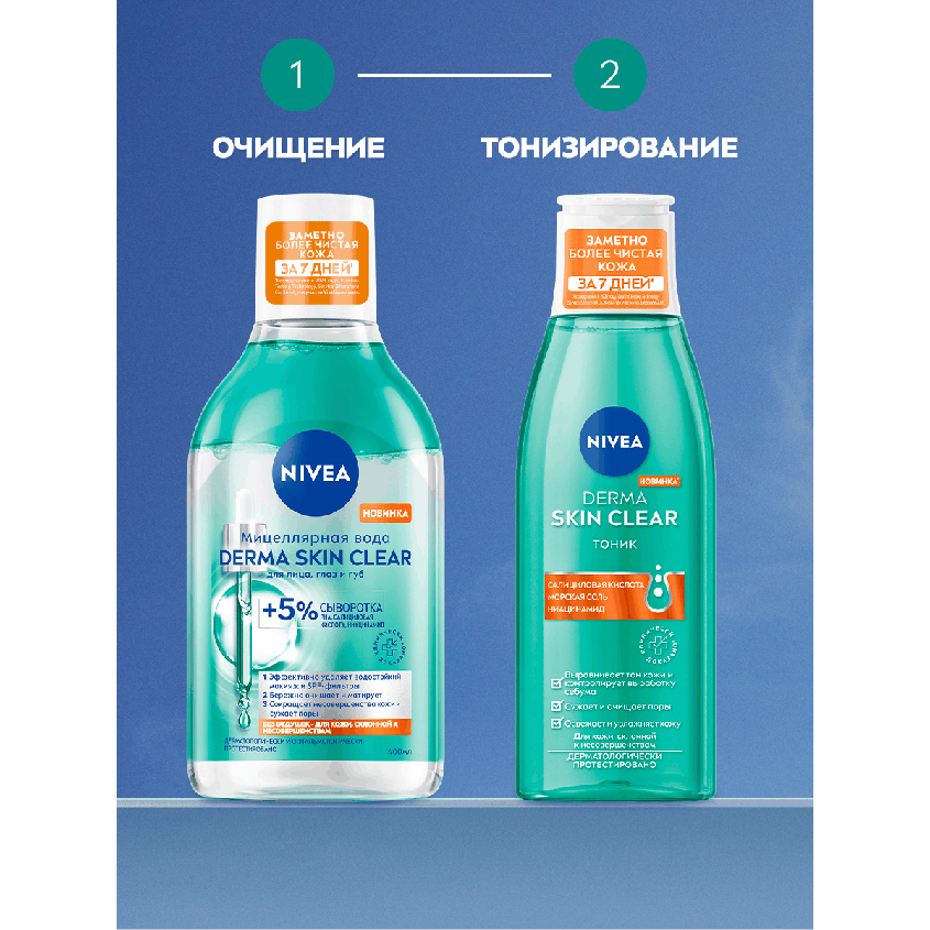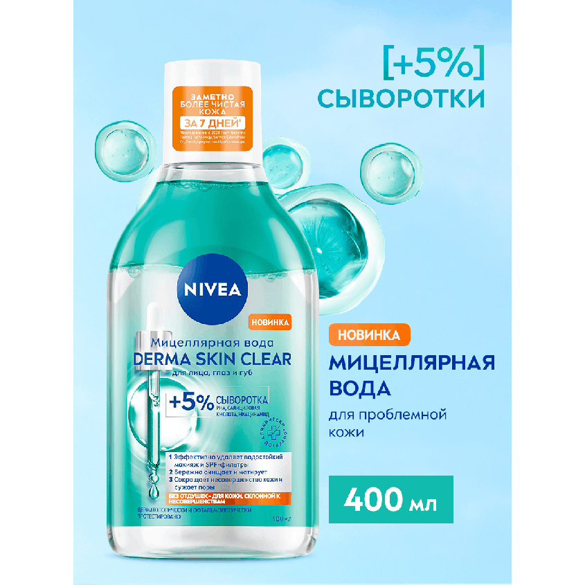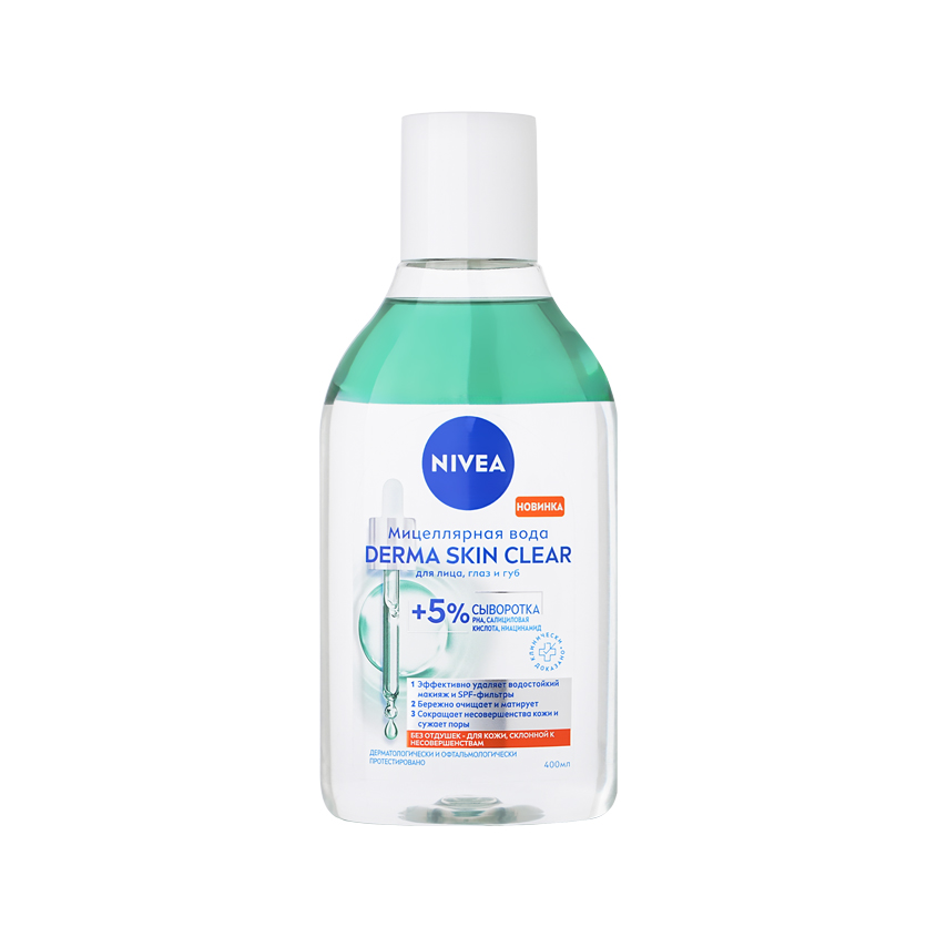 ПОПРОБУЙТЕ НОВИНКУ'! Мицеллярная вода NIVEA DERMA SKIN CLEAR 400 мл — это бережное очищение для кожи, склонной к несовершенствам. Уже через 7 дней кожа становится заметно более чистой* благодаря формуле с 5% активной сыворотки, включающей PHA кислоты, салициловую кислоту и ниацинамид. Средство эффективно удаляет даже водостойкий макияж и SPF всего за несколько прикосновений, не оставляя жирных следов и не требуя трения.
