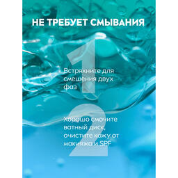 Встряхните для смешения двух фаз. Хорошо смочите ватный диск, очистите кожу от макияжа и туши, не
