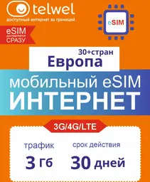 Карта eSIM Telwel Travel пакет Европа 3ГБ 30 дней