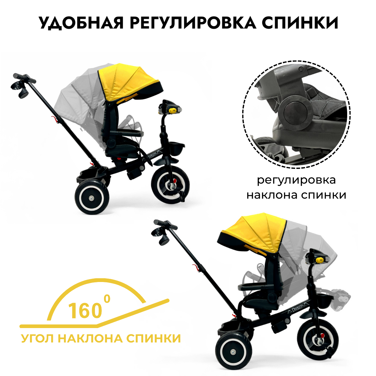 • Возможности регулировки регулировка капюшона, отключение педалей, регулировка наклона спинки (3 положения), регулировка по высоте ручки (3 положения)