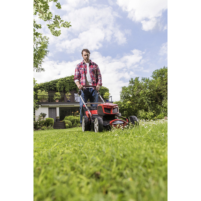 Удобная центральная регулировка высоты среза позволяет легко, одним движением, установить высоту среза в диапазоне от 30 до 75 мм. Это гораздо быстрее, чем переставлять каждое колесо по отдельности, как приходится делать в некоторых моделях.