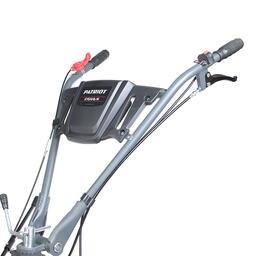 Кнопка включения, ручка газа и рычаг привода размещены на руле, обеспечивая удобное и интуитивно понятное управление. Руль регулируется по наклону, адаптируясь под рост оператора и обеспечивая комфортную работу.
