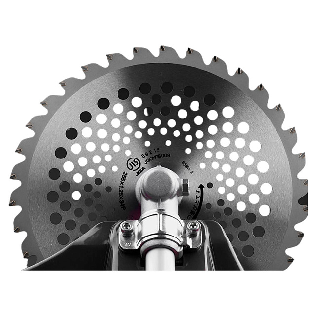 Модель оснащена уникальным диском, который изготовлен из высококачественной стали SK-5. Этот профессиональный диск имеет специальный штампованный круговой барьер, который создает вихревой поток и уводит срезанную траву в сторону от зоны кошения. Благодаря этому, трава не наматывается на редуктор, что предотвращает его перегрев и делает оборудование более долговечным.
