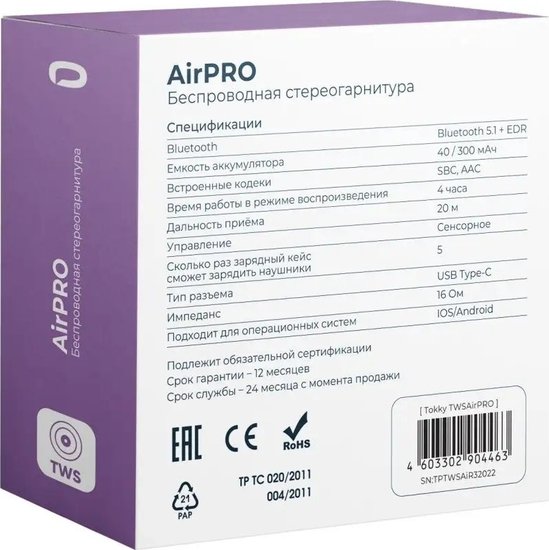 • Тип беспроводных наушников полностью беспроводные (TWS)