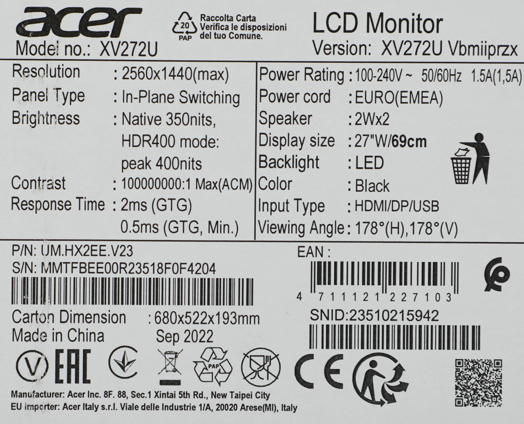 Монитор 27" Acer Nitro XV272UVbmiiprzx, 2560х1440, 170 Гц, IPS, черный (um.hx2ee.v23)