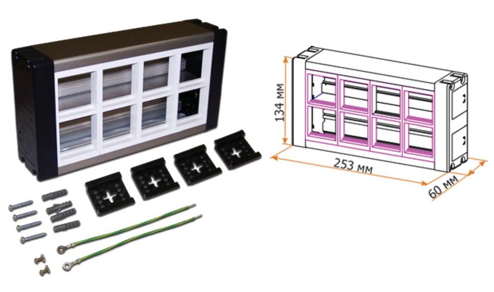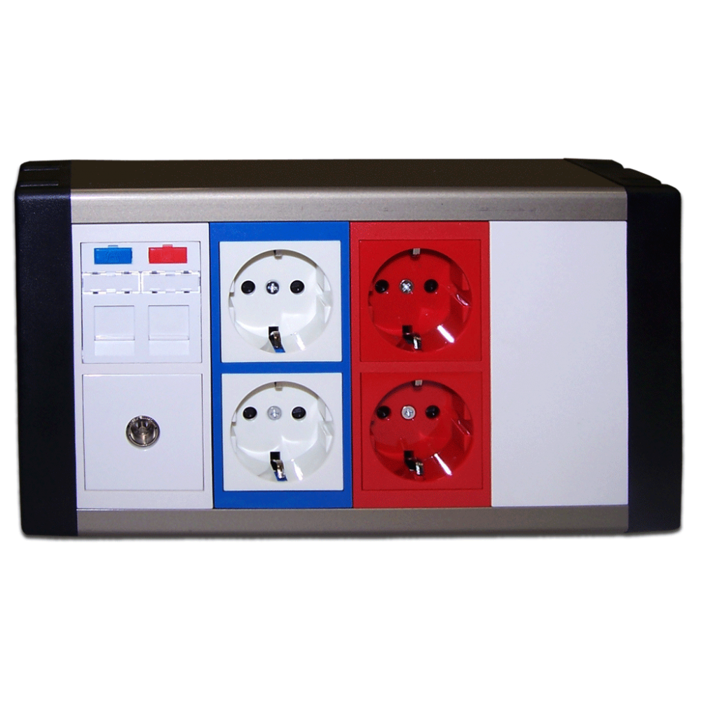 Настенный двухрядный блок предназначена для организации полноценных индивидуальных или многопользовательских рабочих мест.Розеточные блоки хорошо справляются с задачей размещения многопользовательских розеток с определенным набором интерфейсов в местах общего пользования, в помещениях, где расположение точек подключения не определено или меняется. Благодаря модульному принципу комплектации блока, можно создавать различные сценарии комбинирования силовых, телекоммуникационных, мультимедийных розеток.Бокс имеет 8 посадочных мест под французский стандарт Mosaic 45x45 в лицевых панелях ( по 2 места в каждой панели). Бокс в базовой комплектации имеет четыре лицевых панели белого цвета для горизонтально ориентированных модулей. При необходимости панели адаптеров могут меняться на платы других цветов (красные или синие), а также на панели с вертикальной ориентацией устанавливаемых механизмов.Корпус выполнен из алюминиевого сплава. Снаружи имеет анодированное покрытие.Внутри корпуса установлена съемная алюминиевая перегородка.С боковых сторон корпус закрыт пластиковыми крышками, в которых имеются отверстия для ввода кабеля. Отверстия закрыты съемными заглушками. Установка бокса осуществляется на имеющиеся в комплекте 4 опорных площадки на пазы которых одевается алюминиевый корпус.В комплекте также имеются дюбеля, саморезы, а также два проводника заземления с крепежом.Поставляется в индивидуальной коробке.Материал корпуса и перегородки – алюминий.Остальные элементы – ПВХ.Окраска корпуса – анодирование.