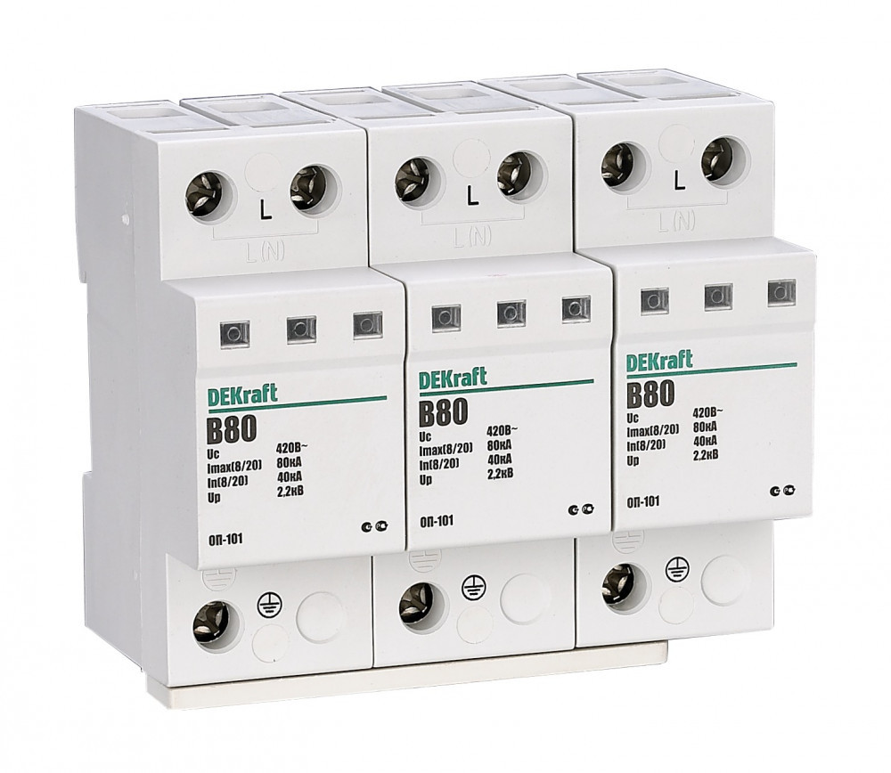 Ограничитель перенапряжения серии ОП-101 Dekraft ; 3P; макс.разрядный ток 80 кА; мак.рабочее напряжение 440 В; класс 1(B); монтаж – на DIN-рейку; ширина – 3 мод. х 18 мм. Ограничители срабатывают за миллиардную долю секунды и надежно защищают оборудование от бросков напряжения. Повышенный уровень защиты позволяет ограничить перенапряжения до 2,2 кВ. Ограничитель оснащён сигнальным контактом. Применяются во ВРУ, ГРЩ, распределительных щитках, коробках и непосредственно возлеппаратов.