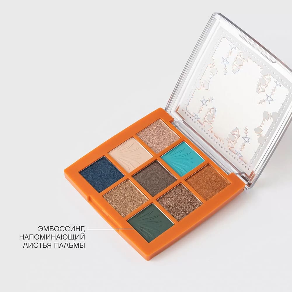 <br>Текстура теней невероятно мягкая, как вечерний африканский воздух, и пигментированная, что позволяет создавать как полупрозрачный, так и насыщенный цвет. Три оттенка в палетке украшены эмбоссингом, напоминающим листья пальмы.