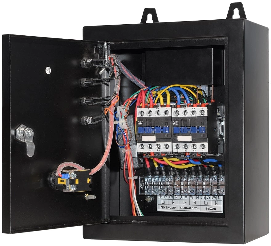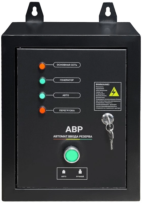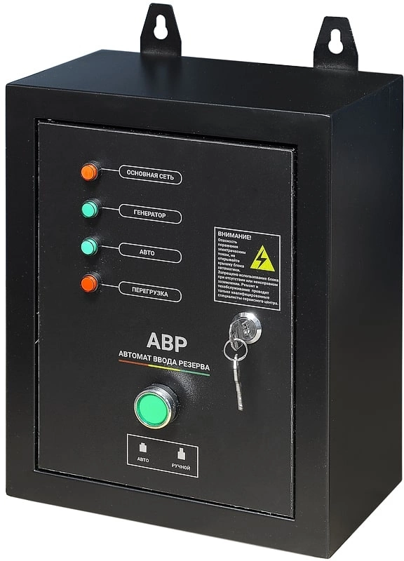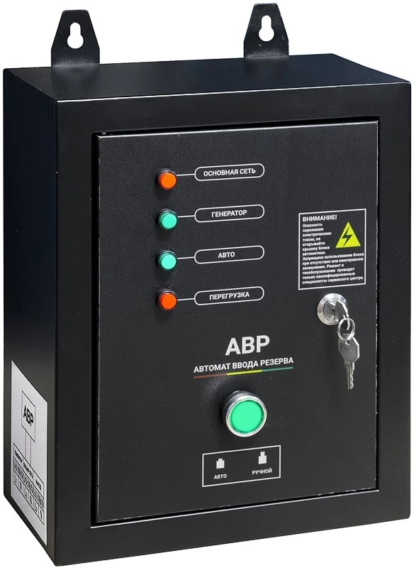 ОсобенностиБлок АВР для дизельных генераторов однофазных и трехфазных от 5 до 9 кВт, включает в себя систему автозапуска. При появлении основного источника электропитания происходит отключение электростанции. Блок автоматического управления для контроля наличия напряжения в сети.