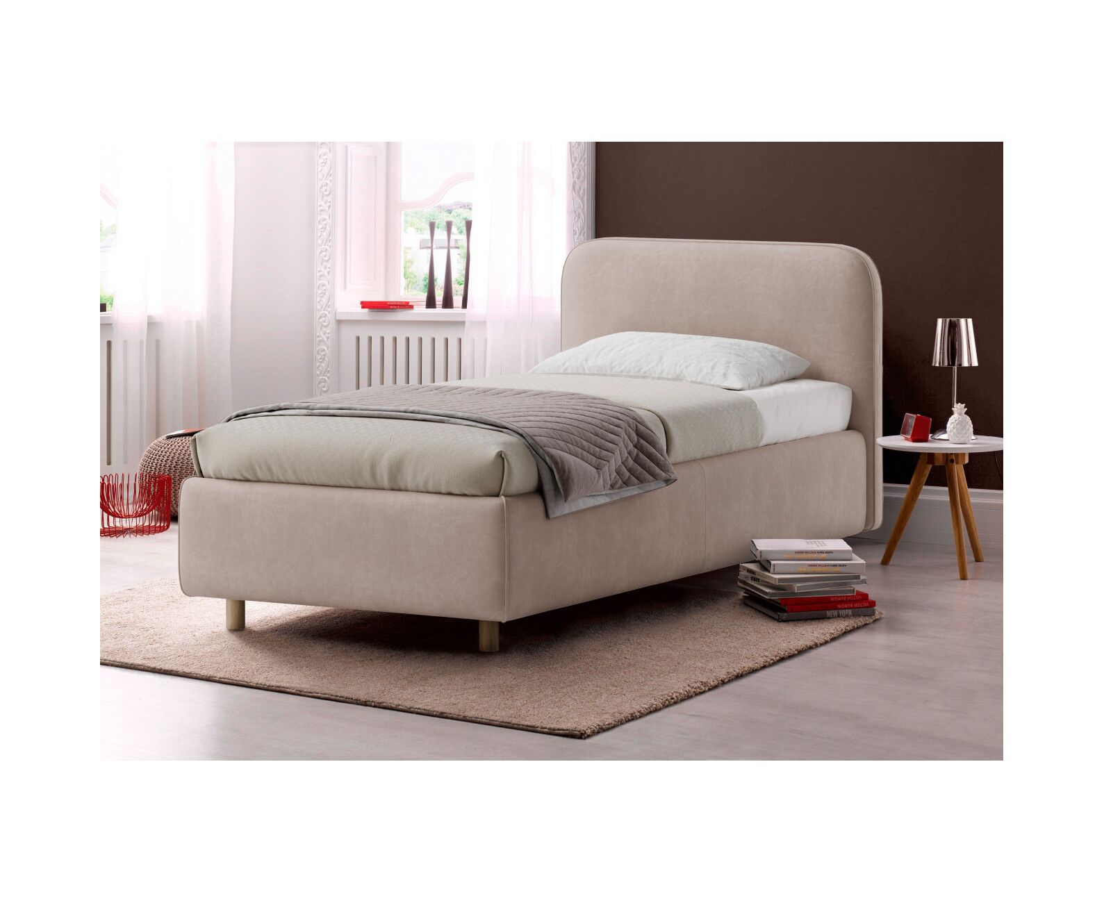 Закругленные углы в изголовье делают модель кровати Миа более мягкой, уютной и нежной. Высокие ножки позволят без труда убирать под кроватью, а съемный чехол с царг позволит легко и быстро очистить любые загрязнения.