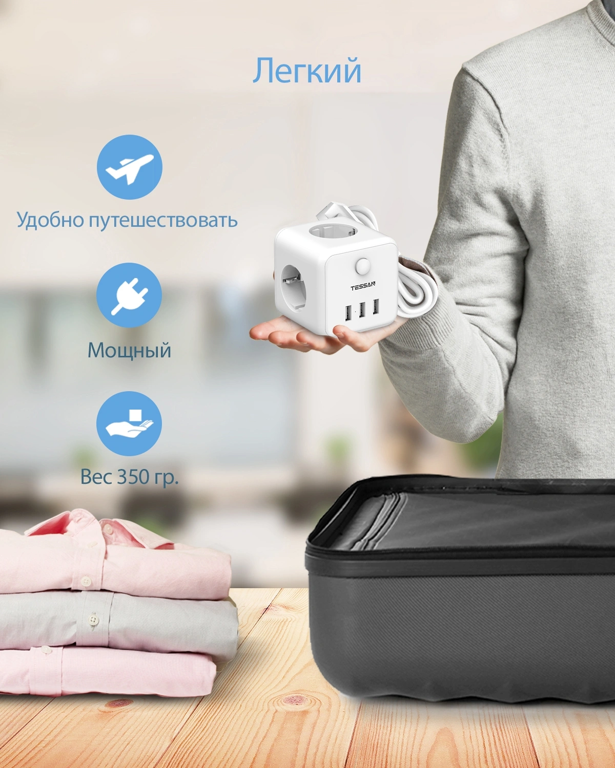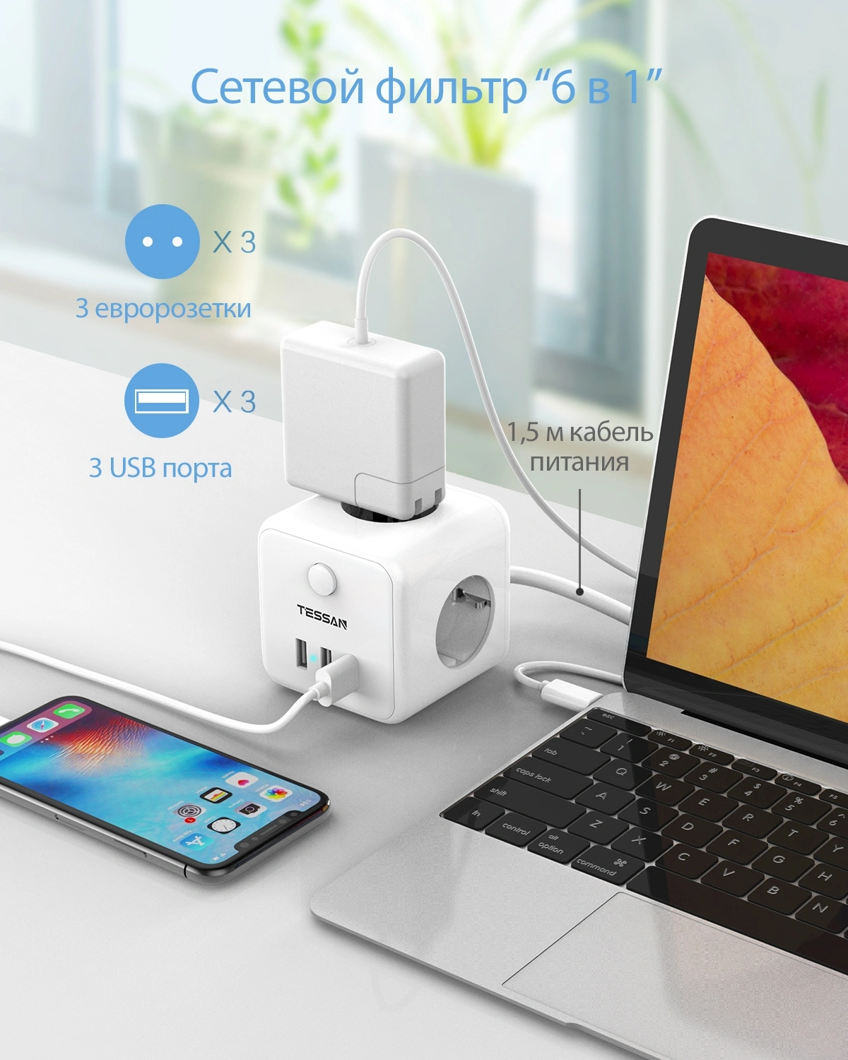 ОписаниеСетевой фильтр с 3 розетками 220В, 3 USB портами и кнопкой питания. Компактный дизайн. LED индикатор. Защита от перегрузки и скачков напряжения. Огнеупорный материал корпуса. Высококачественный медный кабель 1,5 метра. Надежные плотные разъёмы.