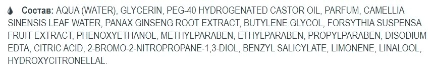 - Активные ингредиенты гидролат зеленого чая, экстракт женьшеня, экстракт форзиции