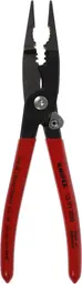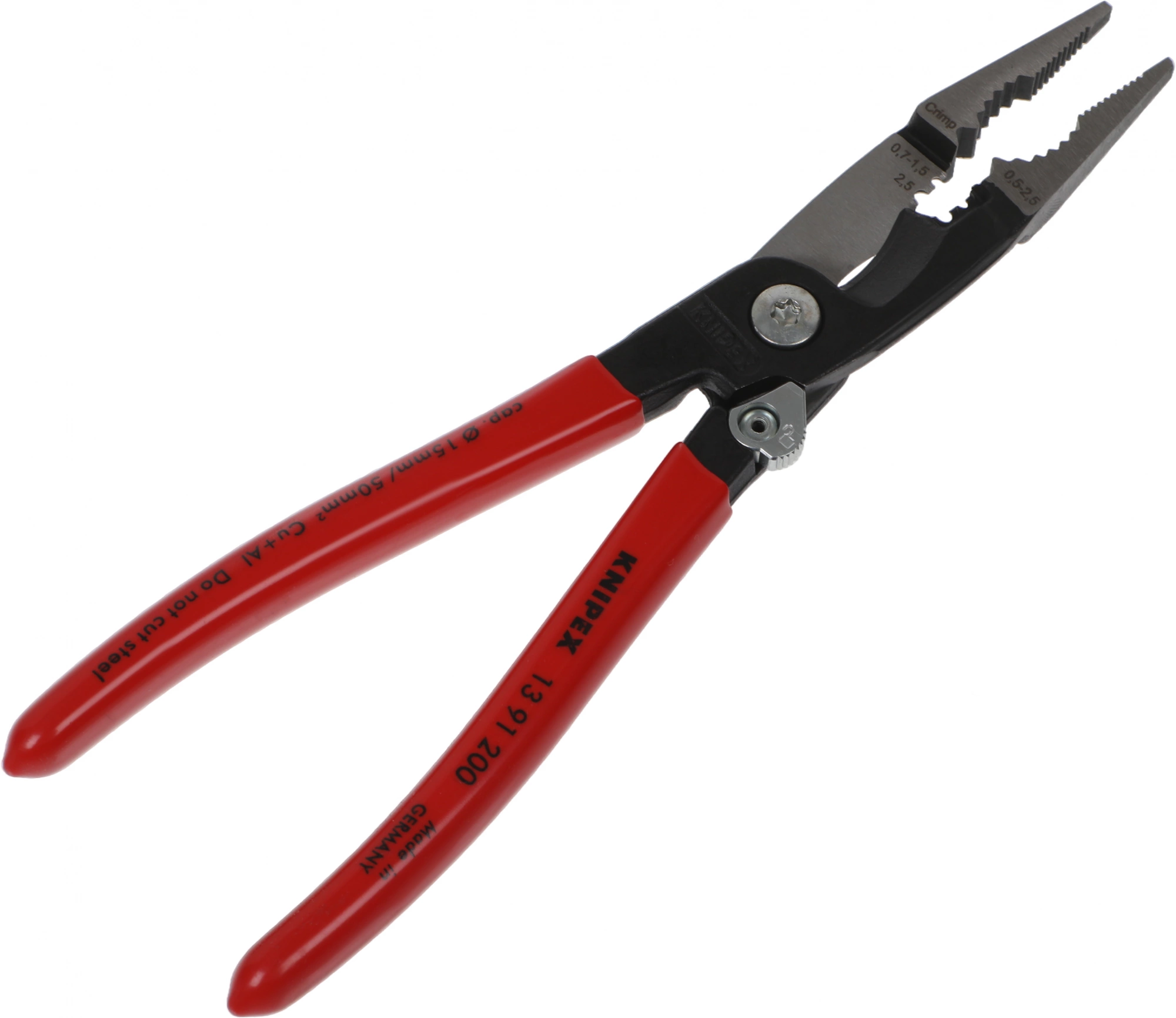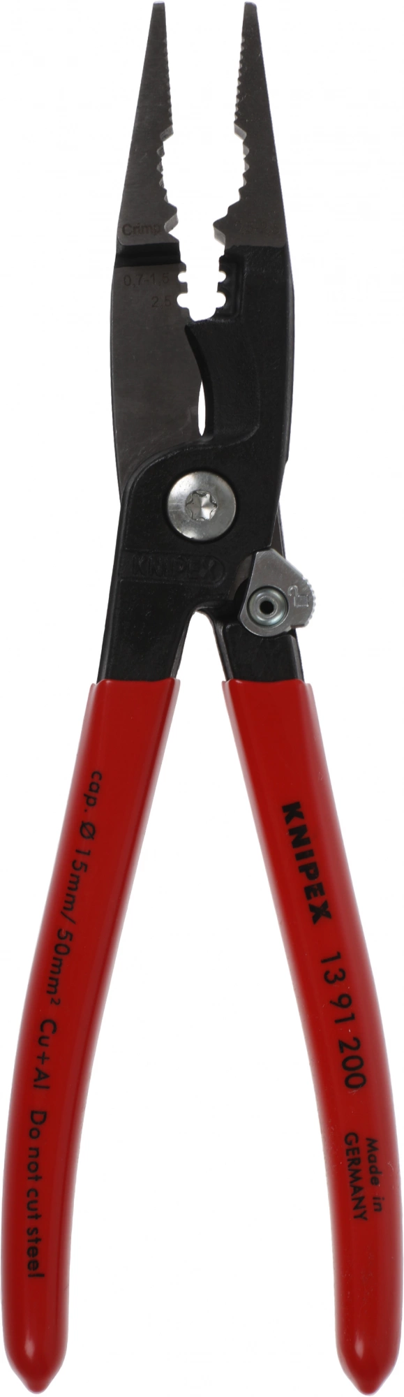 • Описание Клещи электромонтажные, 6-в-1, захват плоского и круглого материала, гибка, удаление заусенцев, снятие изоляции 0.75 - 1.5 + 2.5 мм2, обжимка контактных гильз 0.5 - 2.5 мм2, L-200 мм, кабелерез d 15 мм (5 х 2.5 мм2), защёлка-"собачка", чёрные, обливные рукоятки