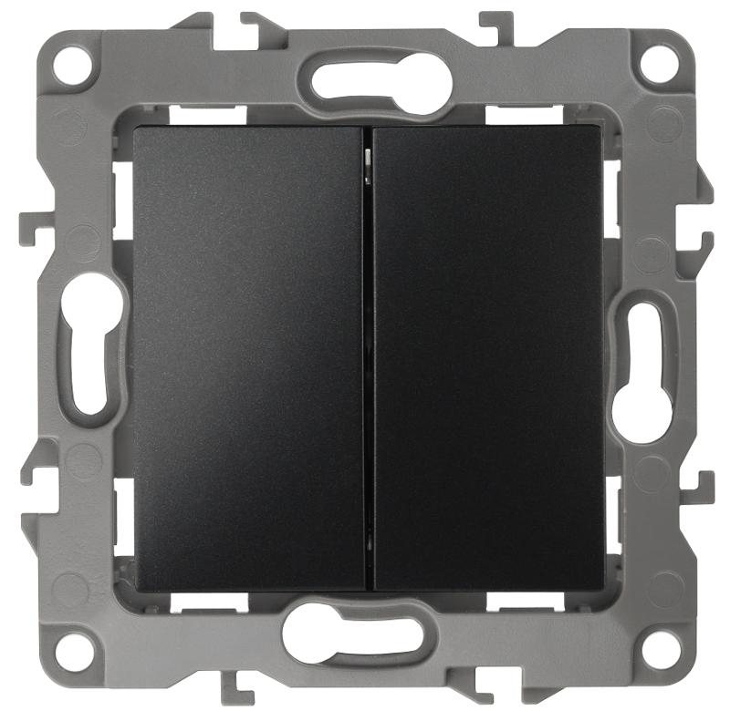 Выключатель 2-клавишный серии Эра 12 скрытой установки механизм цвет антрацит 12-1104-05. Номинальные характеристики 10А 250В . Сделан из поликарбоната, оснащёно автоматическими клеммами для быстрй и надёжной фиксации жил кабеля в механиме. Парные клеммы обеспечивают соединение шлейфом. Монтаж в подрозетник производится и на лапки, и на винты. Рамки приобретаются отдельно.