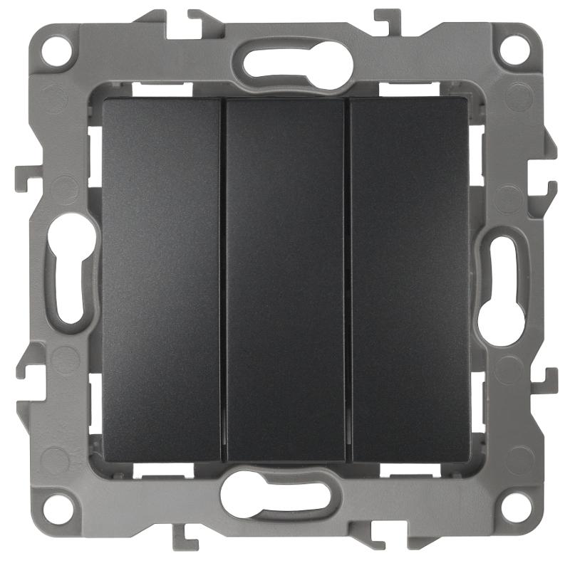 Выключатель 3-клавишный серии Эра 12 скрытой установки механизм цвет антрацит 12-1107-05. Номинальные характеристики 10А 250В . Сделан из поликарбоната, оснащён винтовыми уникальными клеммами ЭКСПЕРТ для надёжной фиксации жил кабеля в механиме. Парные клеммы обеспечивают соединение шлейфом. Монтаж в подрозетник производится и на лапки, и на винты. Рамки приобретаются отдельно. Рамки Эра 12: 1 пост 12-5001-хх, 2 поста 12-5002-хх, 3 поста 12-5003-хх, 4 поста 12-5004-хх, 5 постов 12-5005-хх. Рамки Эра 12 Сатин: 1 пост 12-5101-хх, 2 поста 12-5102-хх, 3 поста 12-5103-хх, 4 поста 12-5104-хх, 5 постов - 12-5105-хх (хх - код цвета: 01-белый, 02-слоновая кость, 03-алюминий, 04-шампань, 05-антрацит, 06-чёрный, 07-ольха(белёный дуб-сатин), 08-вишня, 09-дуб, 10-венге, 11-сосна, 21-жёлтый, 22-оранжевый, 23-красный, 24-охра, 25-бордо, 26-лайм, 27-зелёный, 28-голубой, 29-синий).