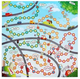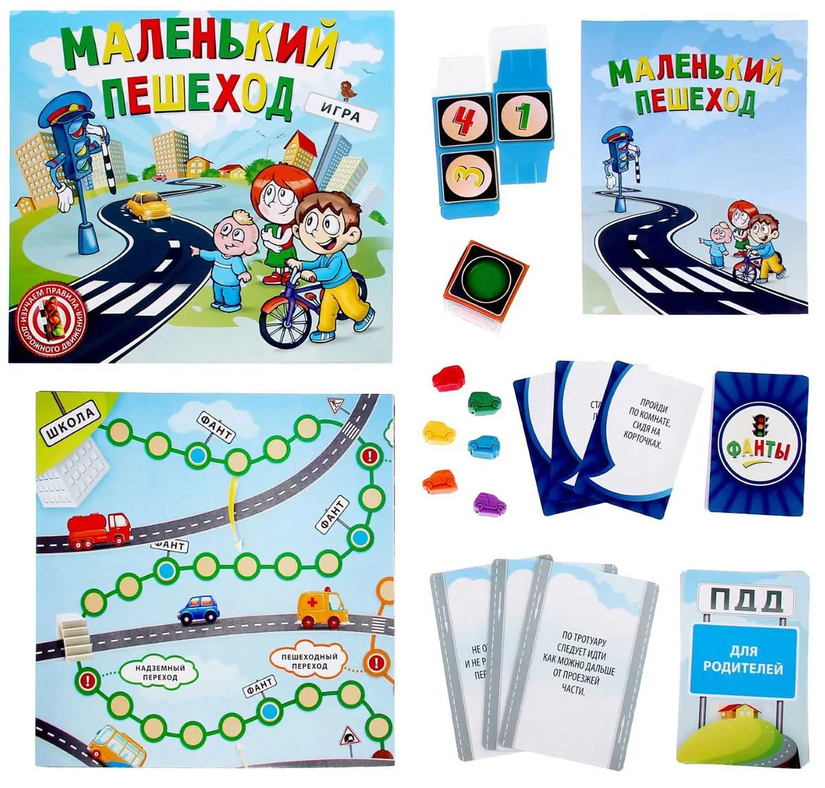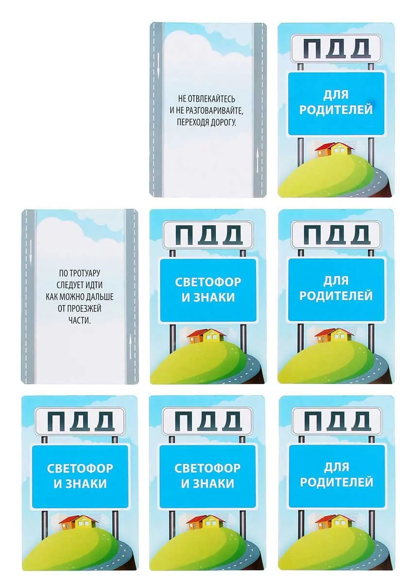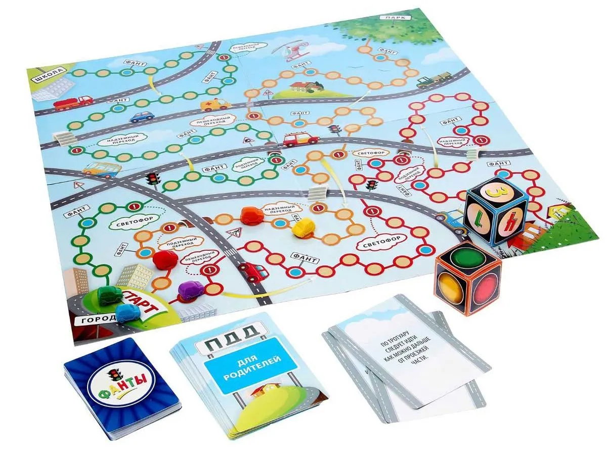 Перед вами увлекательная игра-бродилка, которая познакомит детей с главными правилами дорожного движения. В игровой форме малыши изучат дорожные знаки, узнают, как можно переходить дорогу, а как вести себя нельзя. На игровом поле вы найдёте изображения дома, парка, школы, деревни и дороги. Игроки выбирают, по какому пути они пойдут, и передвигают фишки по полю в сторону своей цели. А на дороге их ждут препятствия, которые помогут быстрее запомнить, как правильно вести себя на улице. Основные правила дорожного движения указаны на карточках — познакомьте с ними ребёнка! А для самых маленьких приготовлены весёлые задания-фанты.