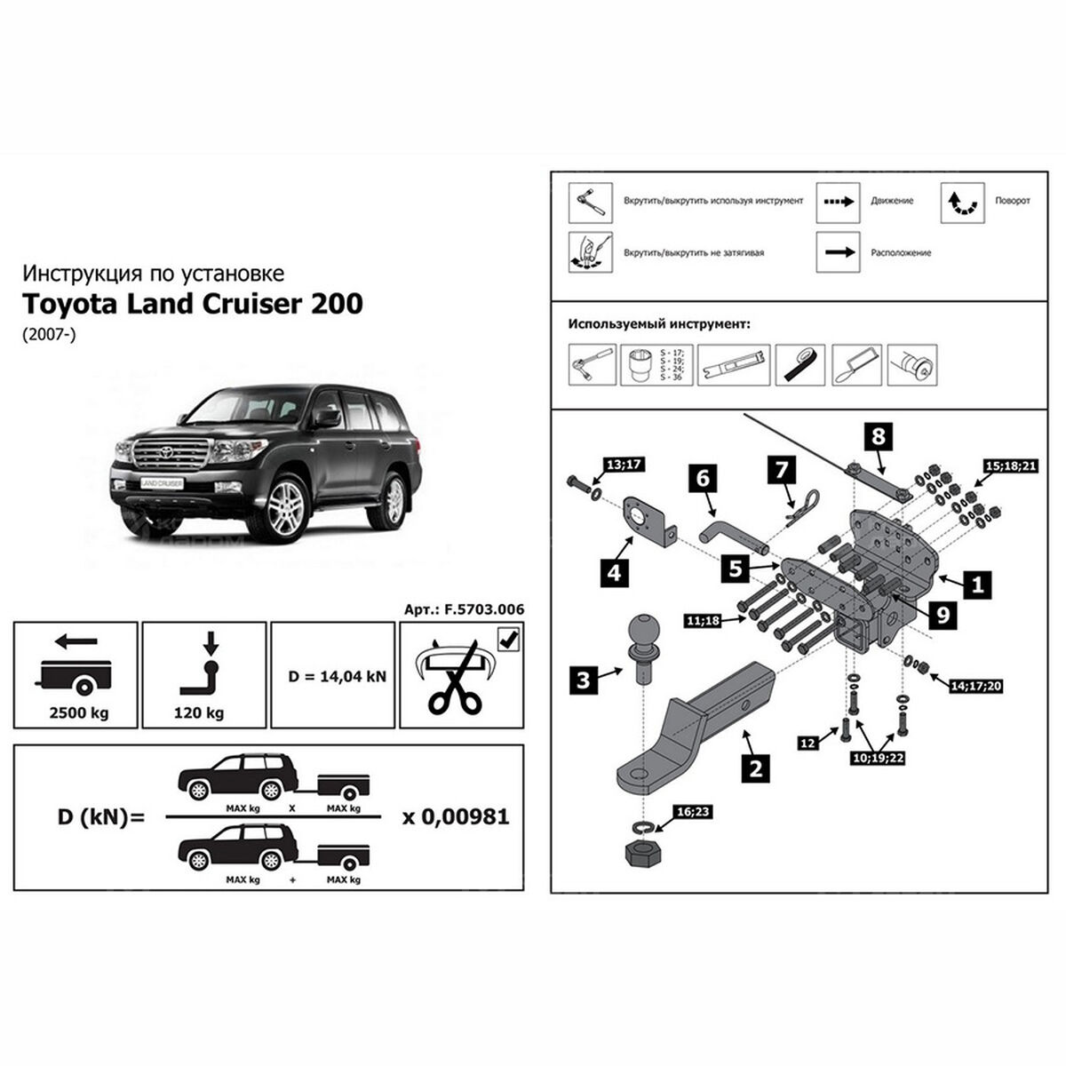 Фаркоп под квадрат Berg (art.F.5713.006) подходит для монтажа на автомобили Toyota Land Cruiser 200, которые выпущены после 2007 года. Исключение — модели Executive, TRD. Выполнен из высокопрочной и устойчивой к деформации стали (8 мм), не окисляется, не ржавеет. Оснащён шаром типа E (диаметр — 50 мм).