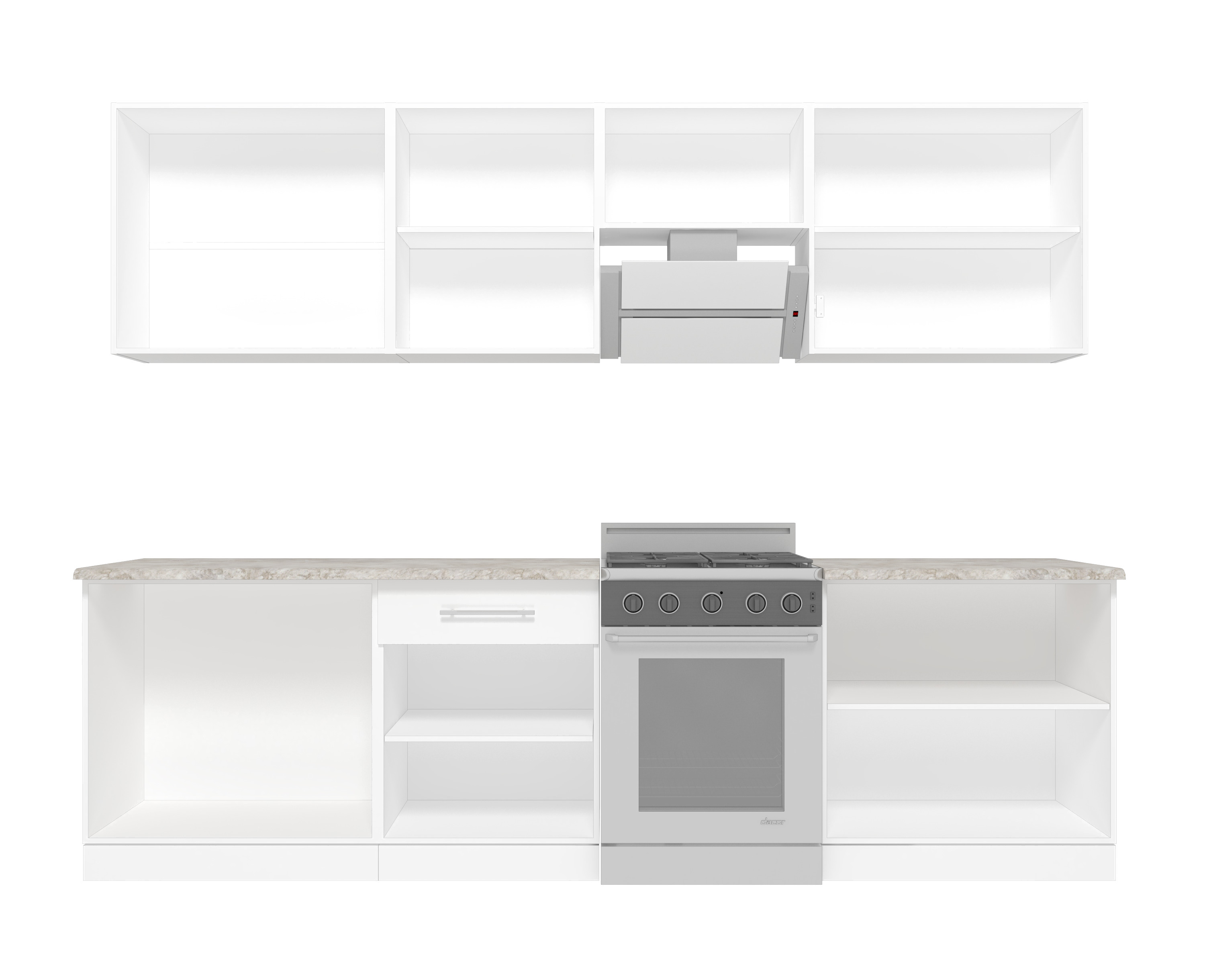 - Глубина верхних шкафов 30 см (32 см — с учетом фасада)