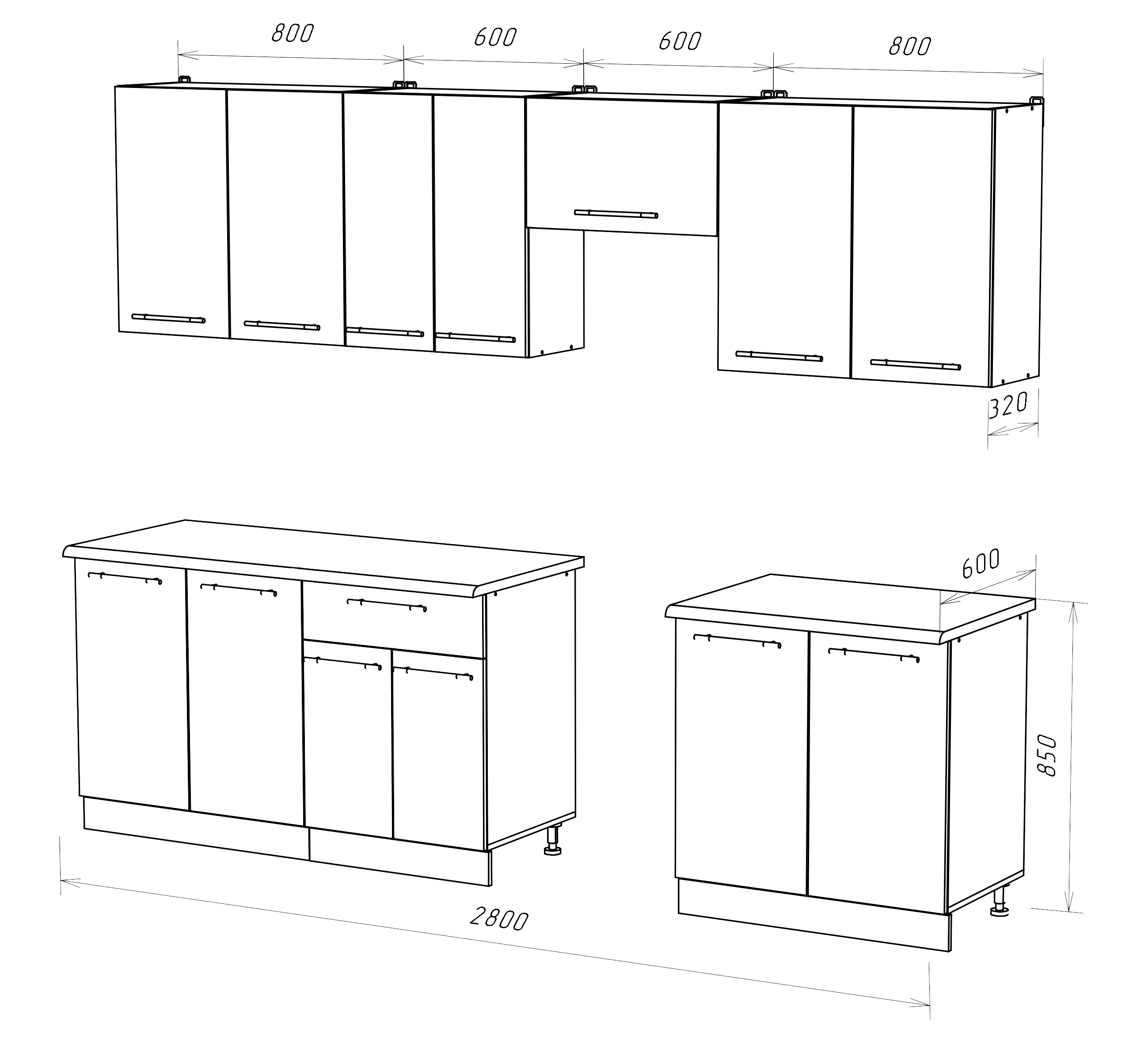 - Глубина нижних шкафов 60 см (48 см — глубина по корпусу)